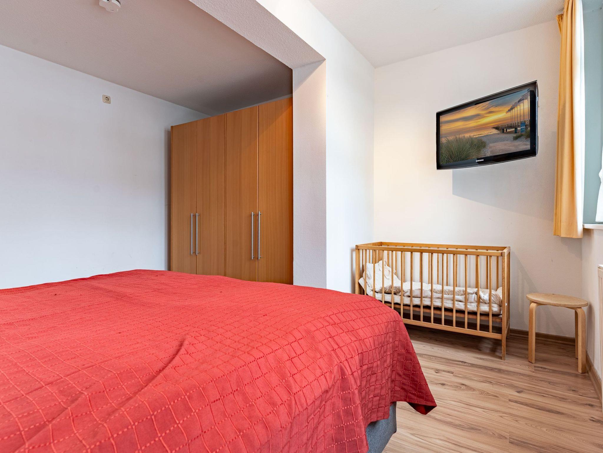 Das separate Schlafzimmer ist mit einem 1,80 m großen Doppelbett, Kleiderschrank, TV und Kinderbett ausgestattet.