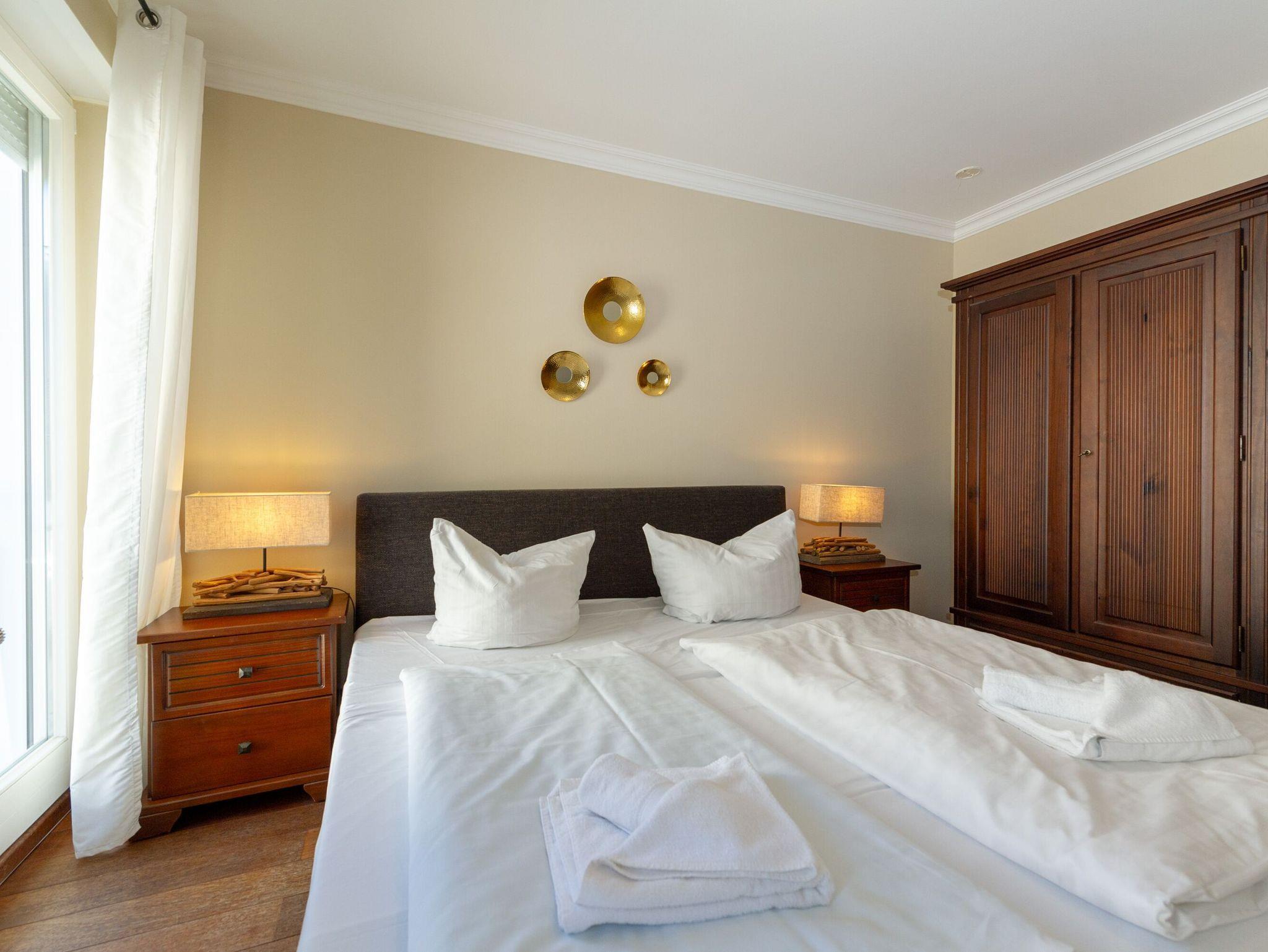 Ihr Zuhause auf Zeit hat zwei separate Schlafzimmer. Diese sind jeweils mit einem bequemen Doppelbett (1,80 x 2,00 m) und einem Kleiderschrank für die Urlaubsgarderobe ausgestattet. Die Fenster lassen sich mit Außenrolläden verdunkeln. Eines der Schlafzimmer verfügt über ein zusätzliches TV-Gerät und ein Wannenbad en suite, dem zweiten Schlafzimmer ist ein Duschbad zugeordnet.