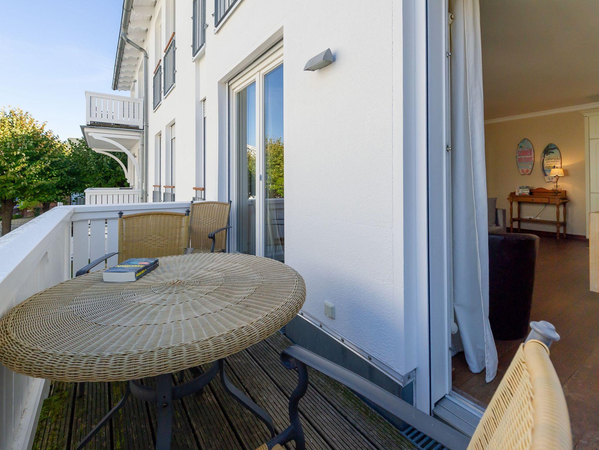 Speisen können Sie ganz nach Belieben am großen Esstisch im Wohnzimmer oder natürlich auch draußen auf dem Balkon in der frischen Ostseeluft. Ein Sonnenschirm sorgt hier bei Bedarf für Schatten.