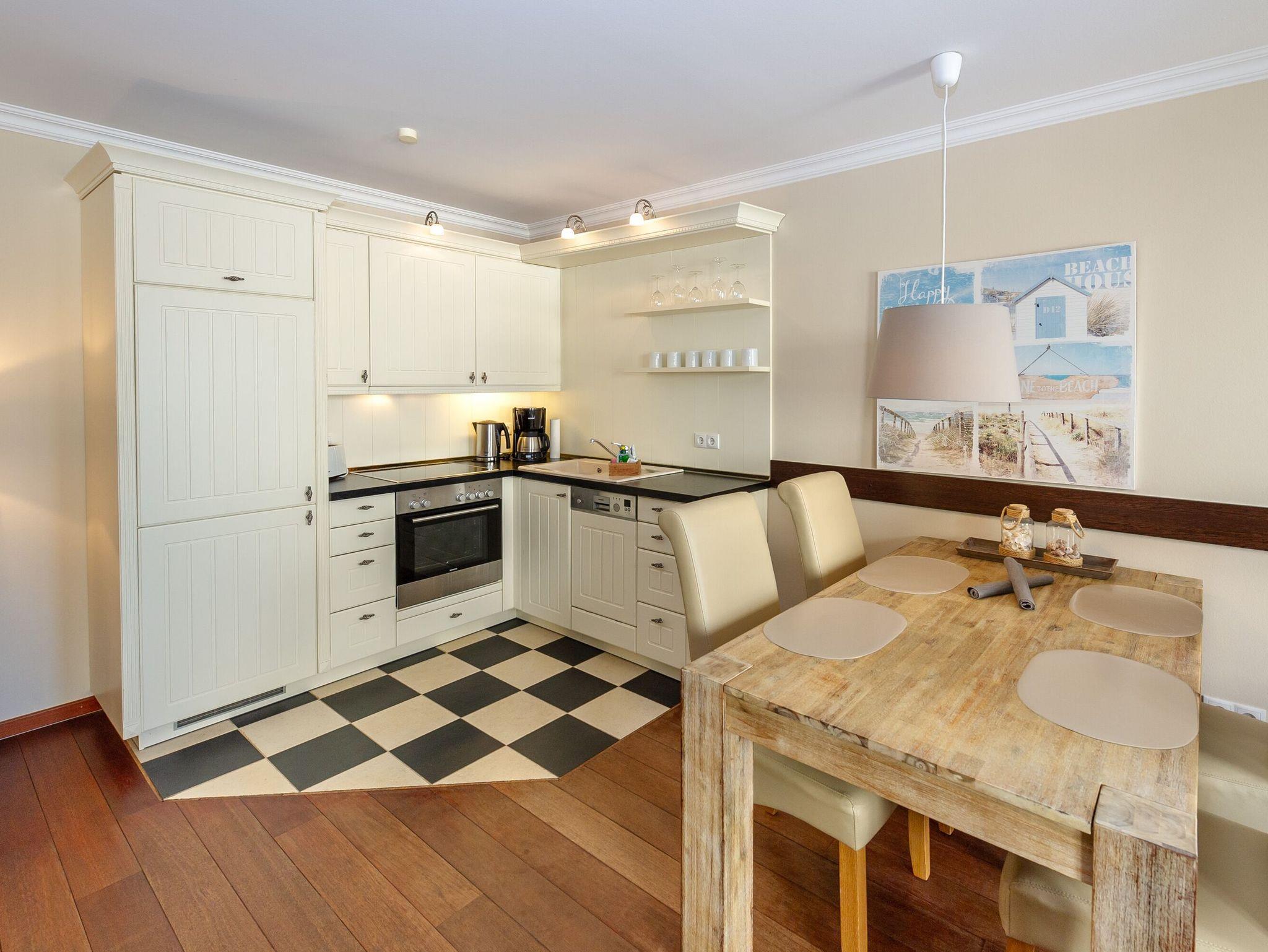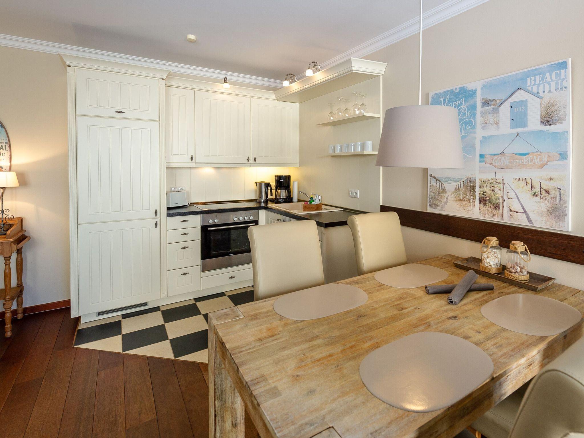 Die offene Küche sieht nicht nur chic aus, sondern ist mit modernen Geräten und allem nötigen Zubehör bestens ausgestattet. So stehen Ihnen hier neben einem Ceranherd mit Backofen und Dunstabzug u.a. eine Geschirrspülmaschine, ein Kühlschrank sowie eine Filterkaffeemaschine, ein Wasserkocher und ein Toaster zur Verfügung. Bis zum nächsten Bäcker für die frischen Frühstücksbrötchen sind es nur etwa drei Gehminuten.