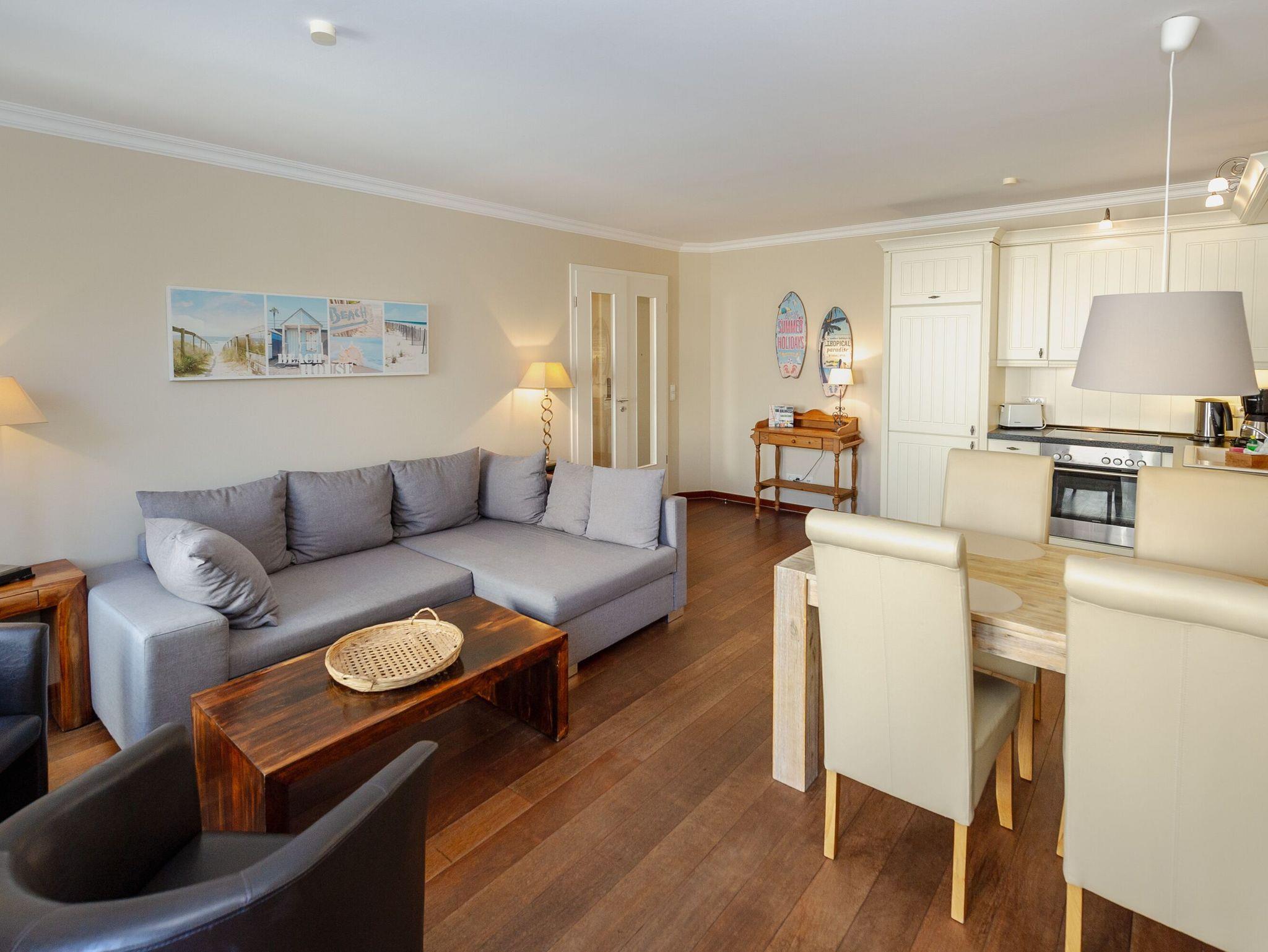 Der großzügige und überaus behaglich eingerichtete Wohn-/Essbereich mit offener Küche und dem vorgelagerten Balkon ist perfekt, um einfach mal die Seele baumeln zu lassen, zu lesen, einen guten Film zu schauen, zu kochen, zu spielen … - einfach eine schöne und ungezwungene Zeit zu verbringen. Zur technischen Ausstattung zählen ein großer Flachbild-TV, ein DVD/CD-Player und gratis W-LAN.