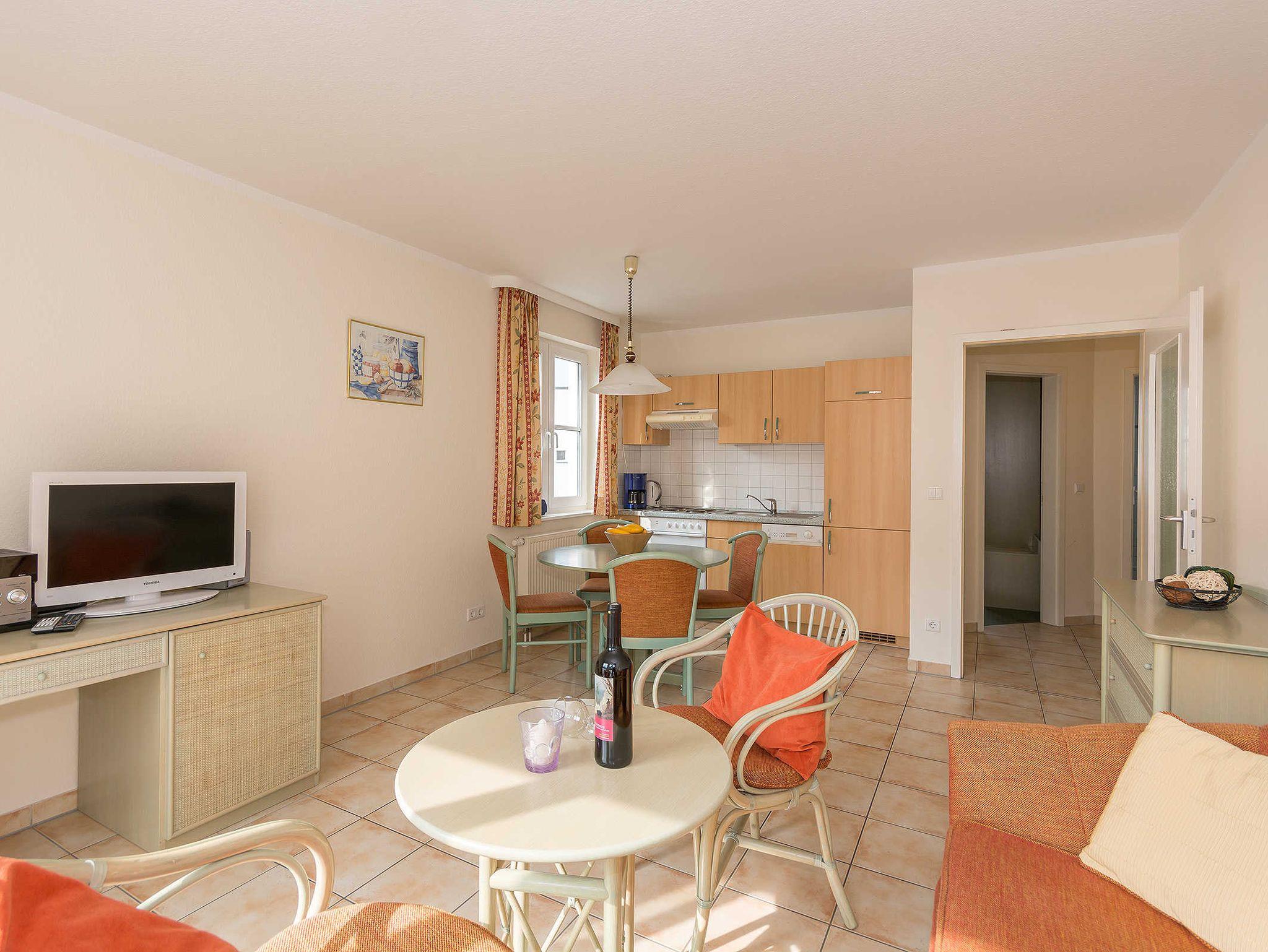 Im Wohnraum erwartet Sie eine Schlafcouch, TV, Stereoanlage mit CD Player, die offene Küche ist mit Geschirrspüler, Backofen uvm. ausgestattet. Am runden Esstisch haben 4 Personen bequem Platz.