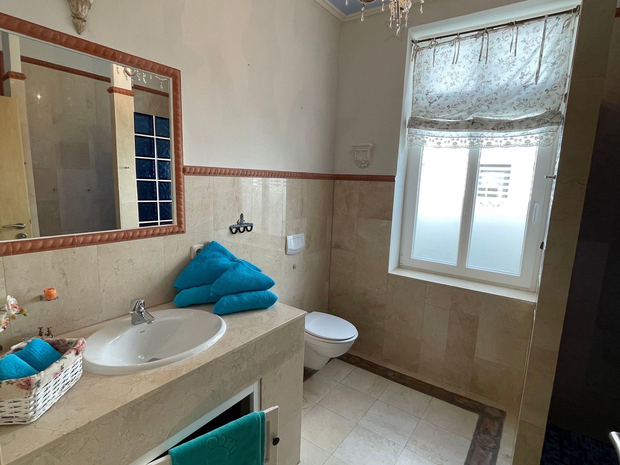 Marmor Duschbad mit WC, Fenster und Fußbodenheizung.