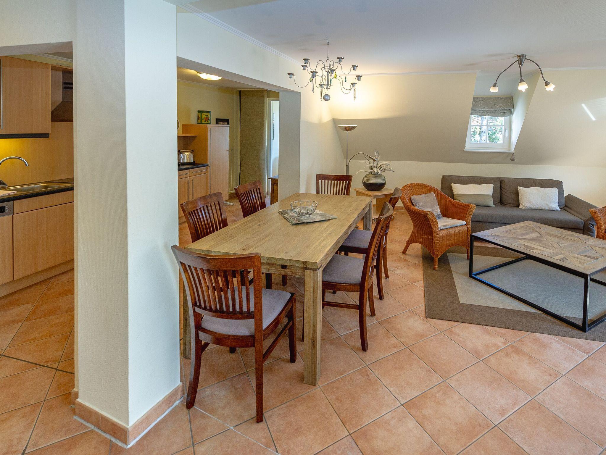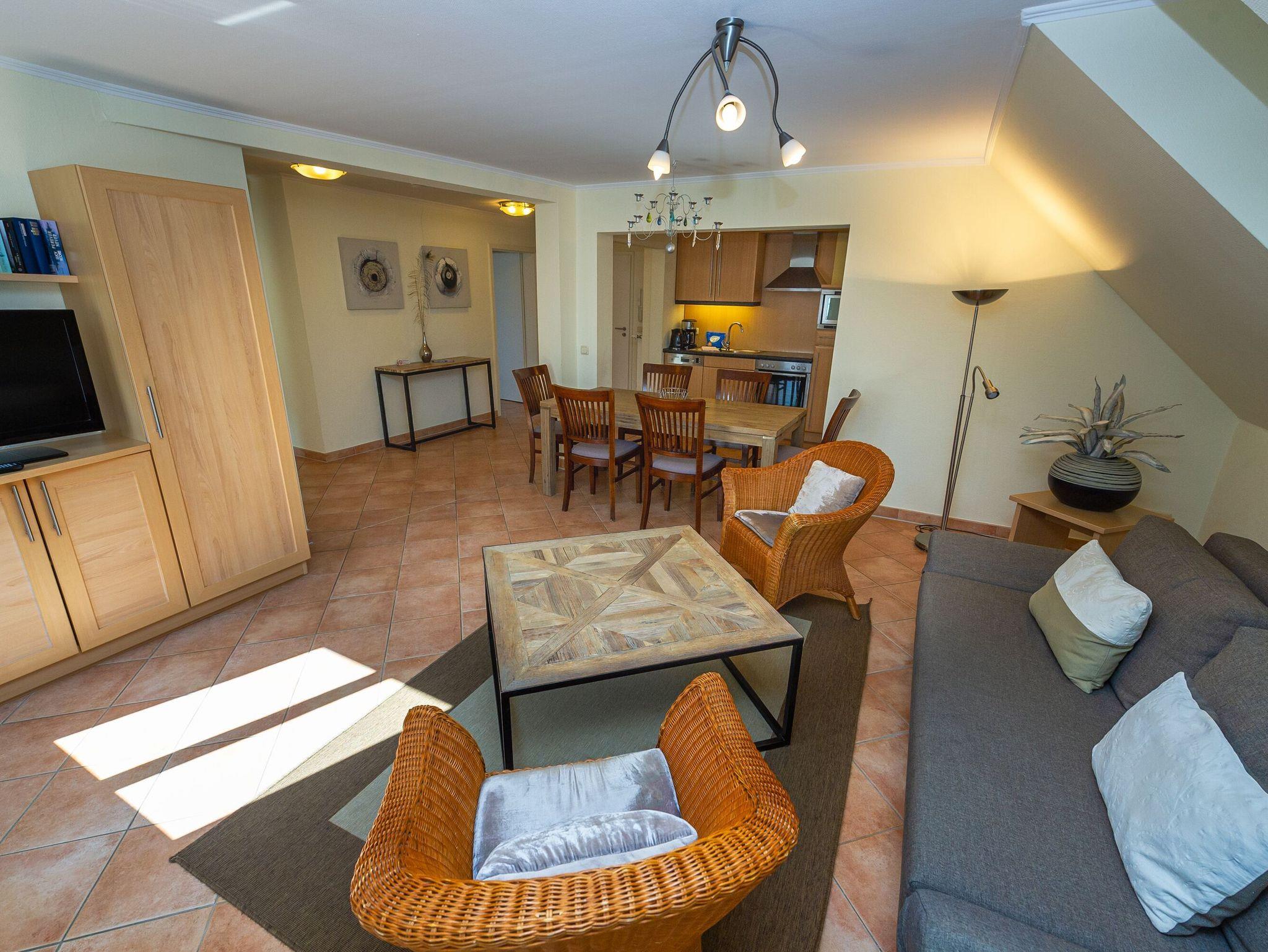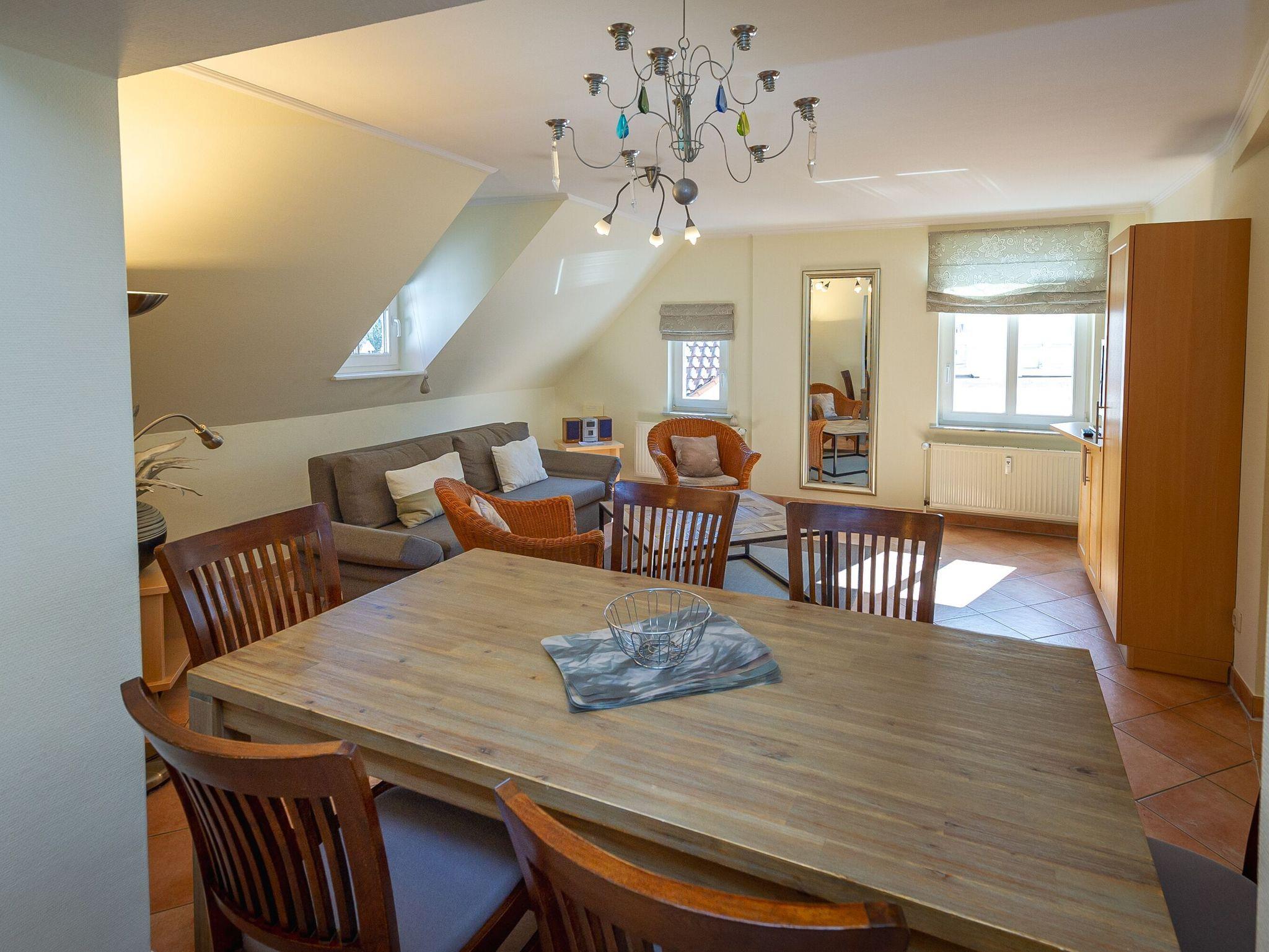 Vom Eingangsbereich aus gelangen Sie in den großzügigen Wohnbereich unter leichten Dachschrägen. Geschickt in die einzelnen Funktionsbereiche unterteilt, finden Sie hier u.a. eine Couch (Schlafgelegenheit für 1 Person), zwei Korbsessel, einen Flachbild-TV, Radio/CD-Spieler und den großen zentralen Esstisch mit Platz für die ganze Familie. Internet per W-LAN steht Ihnen kostenlos zur Verfügung. Der schöne Wintergarten zur Vormittagssonne bietet einen perfekten Rückzugsort für ein gutes Buch oder die Tasse köstlichen Kaffee.
