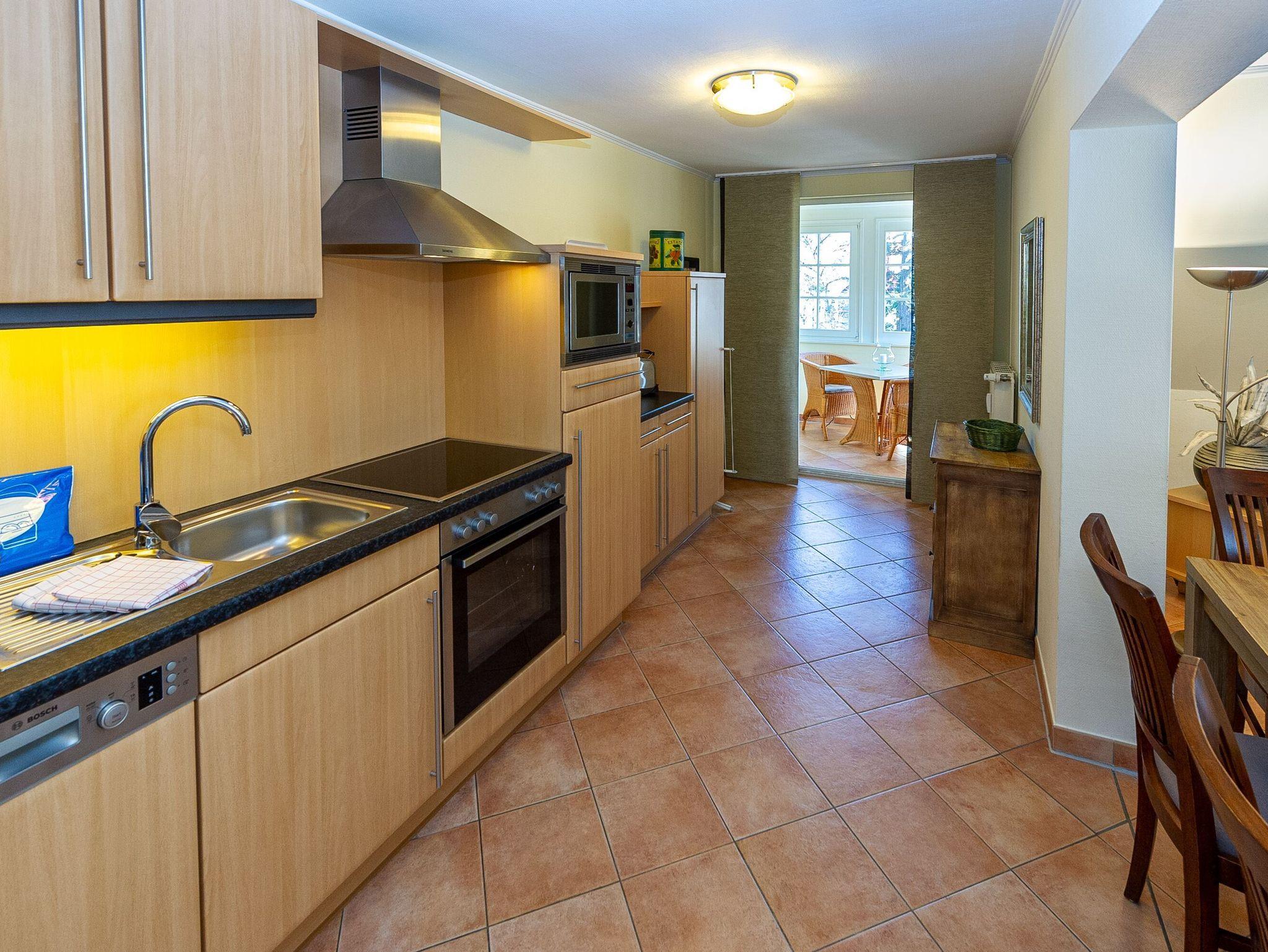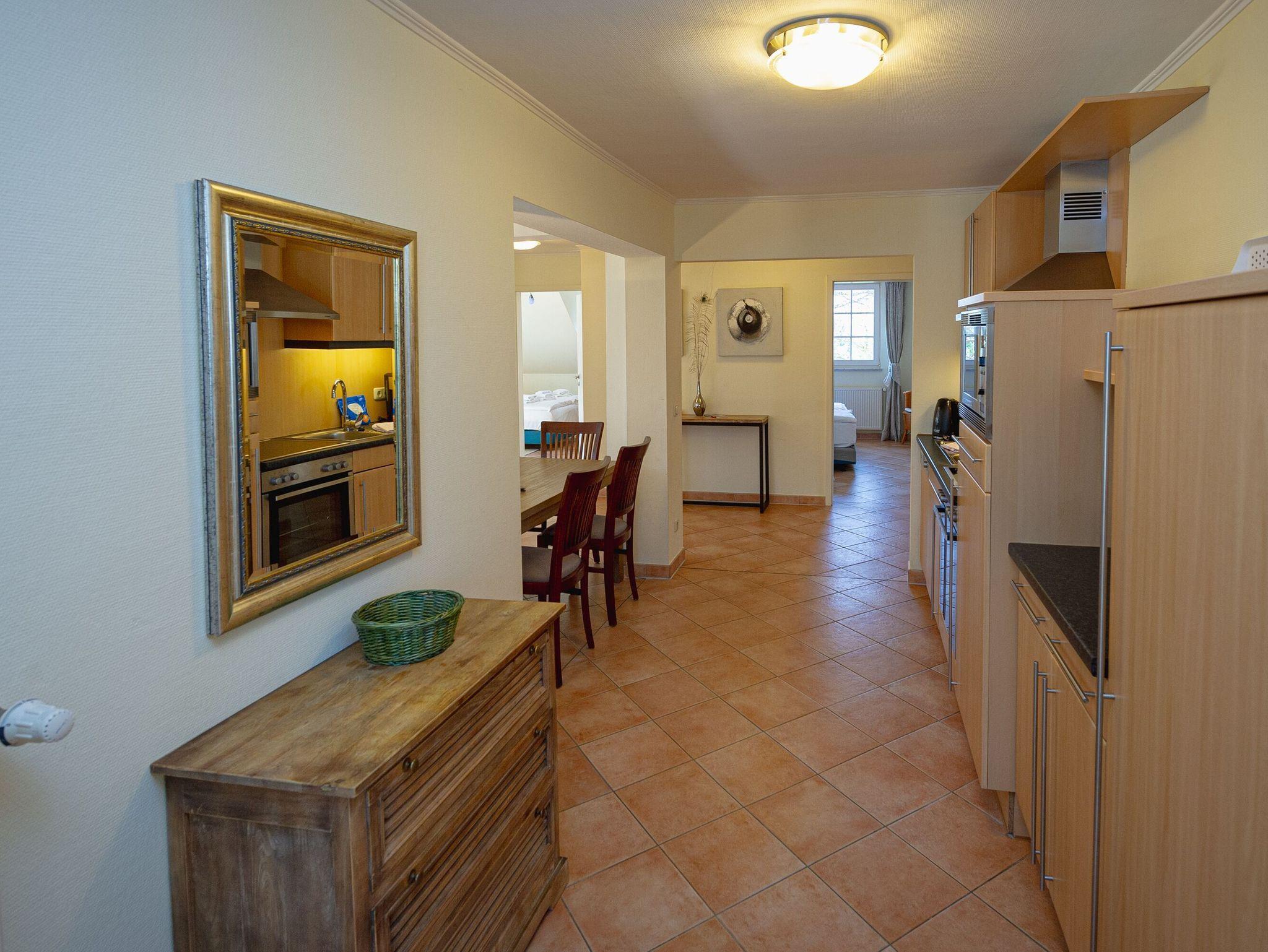 Die offene Küche ist bestens ausgestattet, damit man sich selbst versorgen kann. Hier finden Sie u.a. einen Ceranherd mit Backofen und Dunstabzugshaube, eine Spülmaschine, eine Mikrowelle sowie Kaffeemaschine, Wasserkocher und Toaster. Der nächste Bäcker ist ca. 2 Gehminuten entfernt und auch bis zum nächsten Einkaufsmarkt ist es nicht weit.