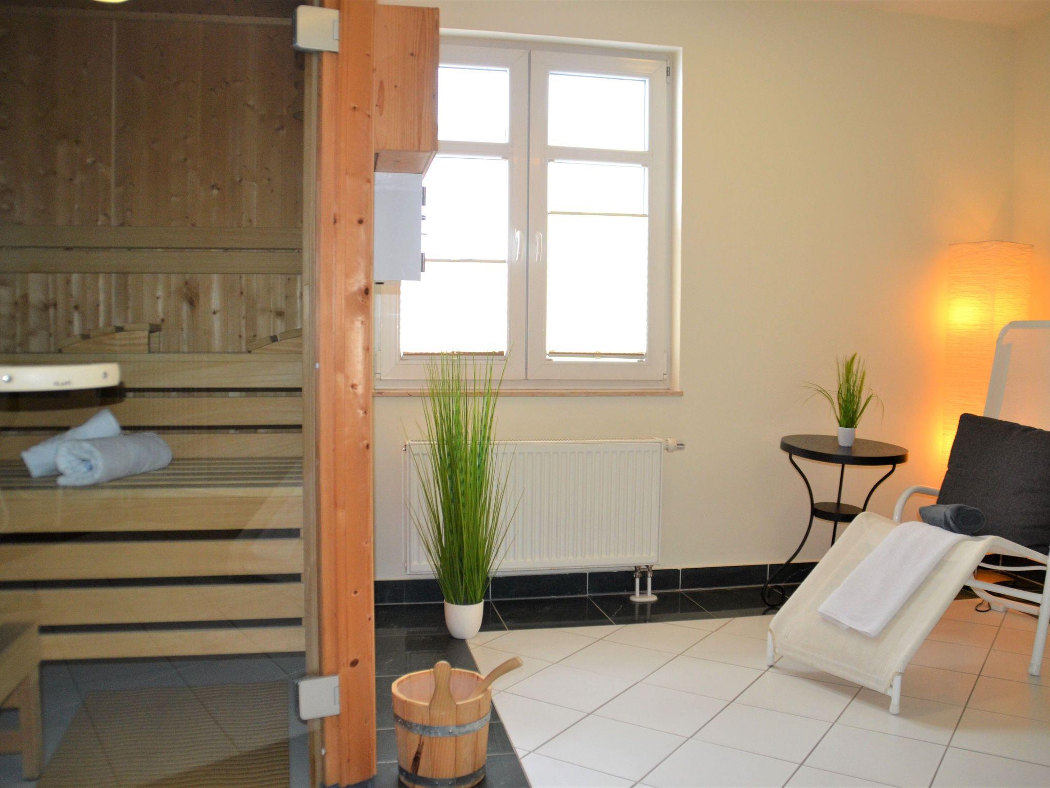 Ebenfalls auf der 1. Etage befindet sich ein Saunabereich mit Dusche. Ruheliegen in dem kleinen Wellness-Areal laden zum Erholen ein.