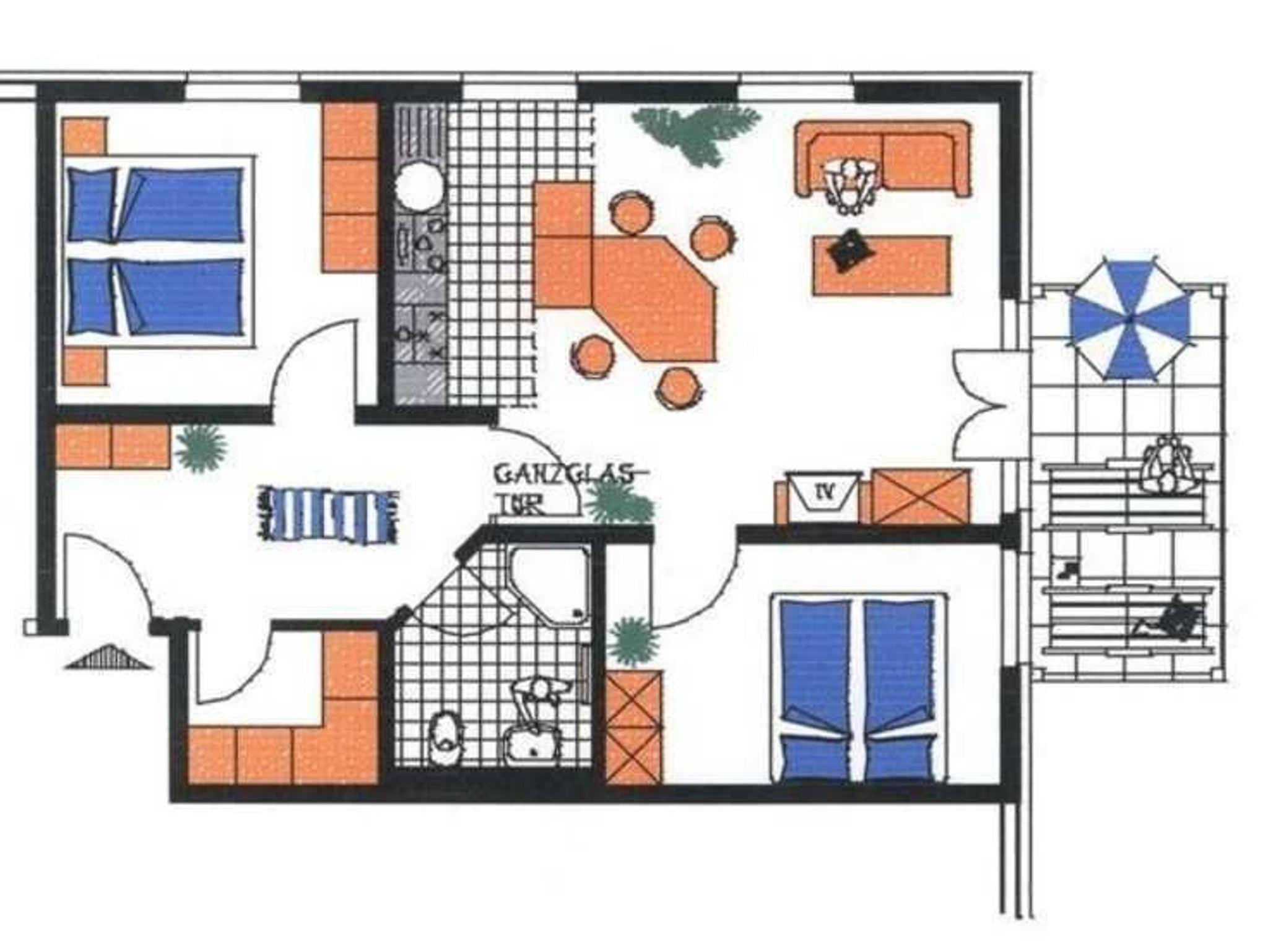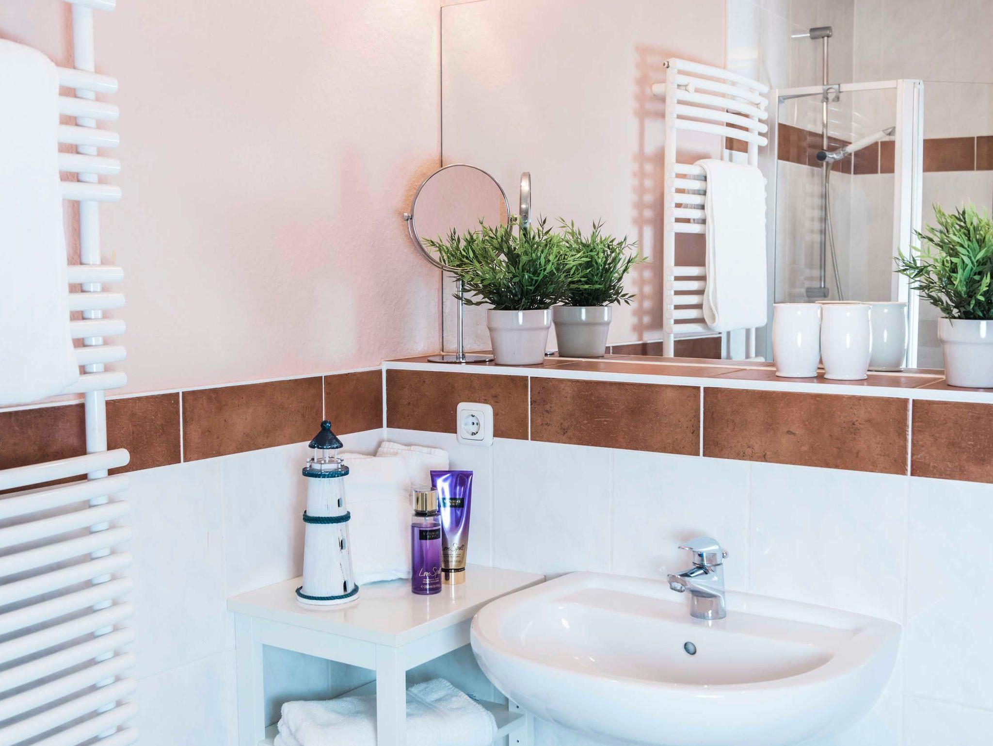 Es gibt 2 Doppelschlafzimmer (beide Betten jeweils 1,60 m x 2,00 m) und 1 Bad mit Dusche/WC. Verdunkelungsmöglichkeiten durch Jalousien bzw. Vorhänge sorgen für einen angenehmen Schlafkomfort.