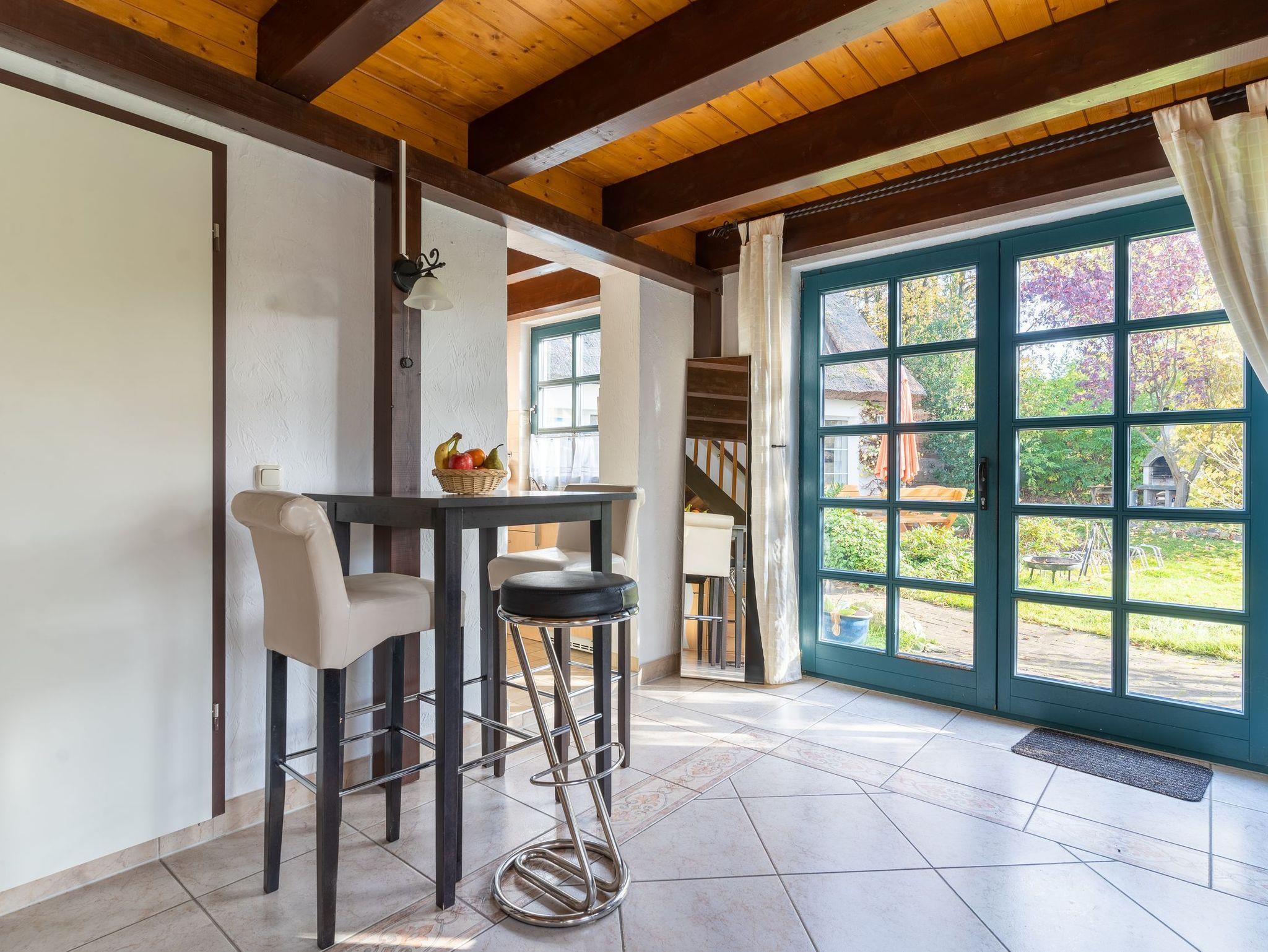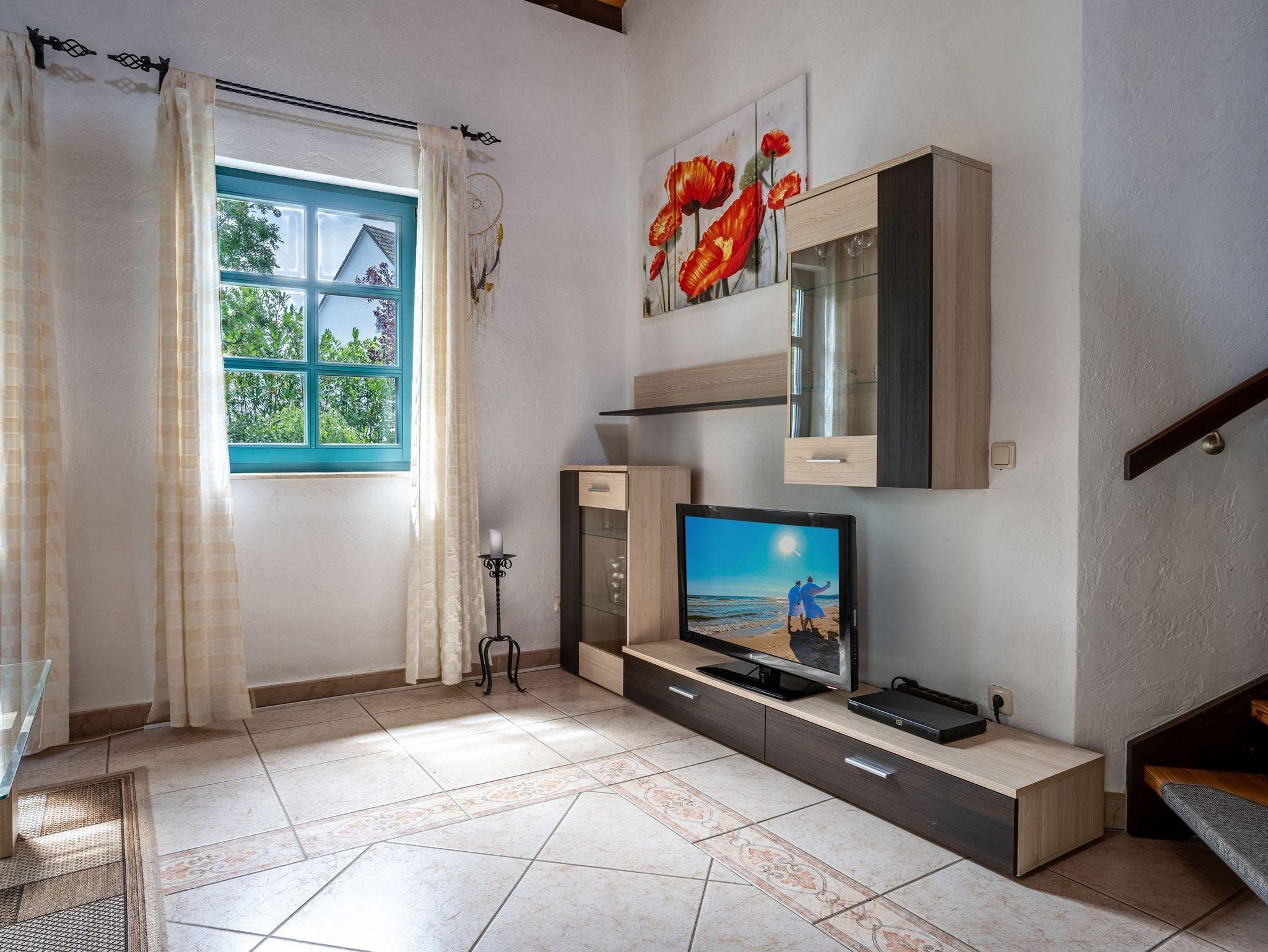 Die Ferienwohnung bietet auf 52 qm Platz für bis zu 2 Personen (Aufbettung 1 Person bis 10 Jahre möglich). Der Wohnbereich im Erdgeschoß verfügt über eine große Couch, TV und einen Essplatz. Die angrenzende Küche ist ausgestattet mit Herd, Backofen, Kühlschrank, mit Tiefkühlfach, Kaffeemaschine, Toaster, Wasserkocher.