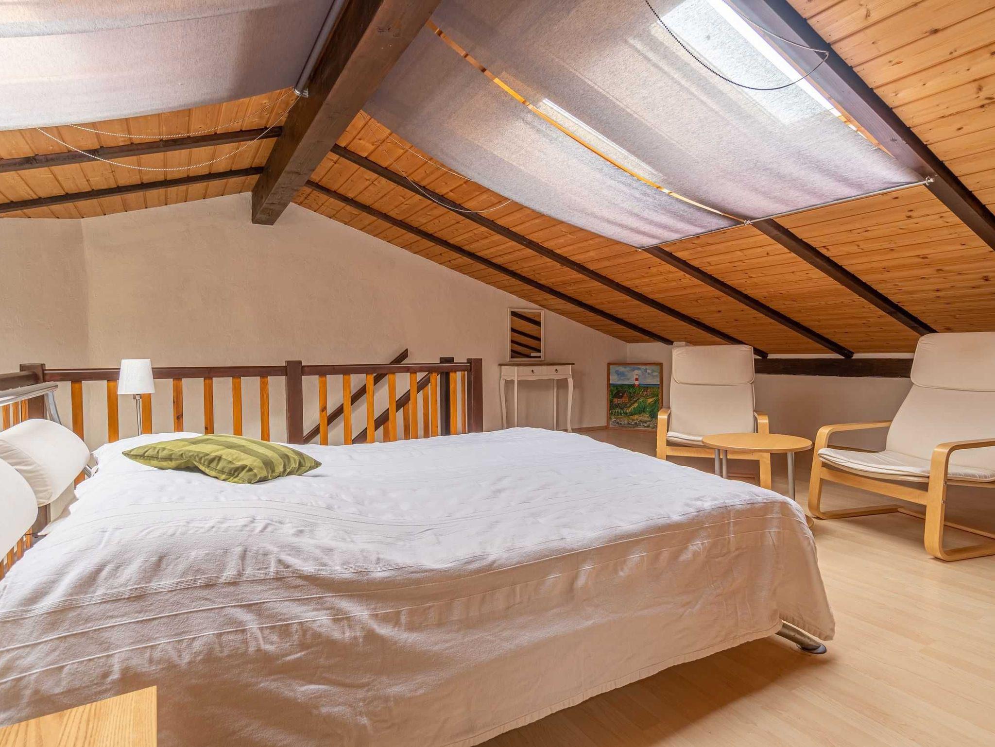Über eine Treppe kommen Sie zur offenen Schlafgalerie mit Doppelbett sowie einer kleinen Schlafcouch.