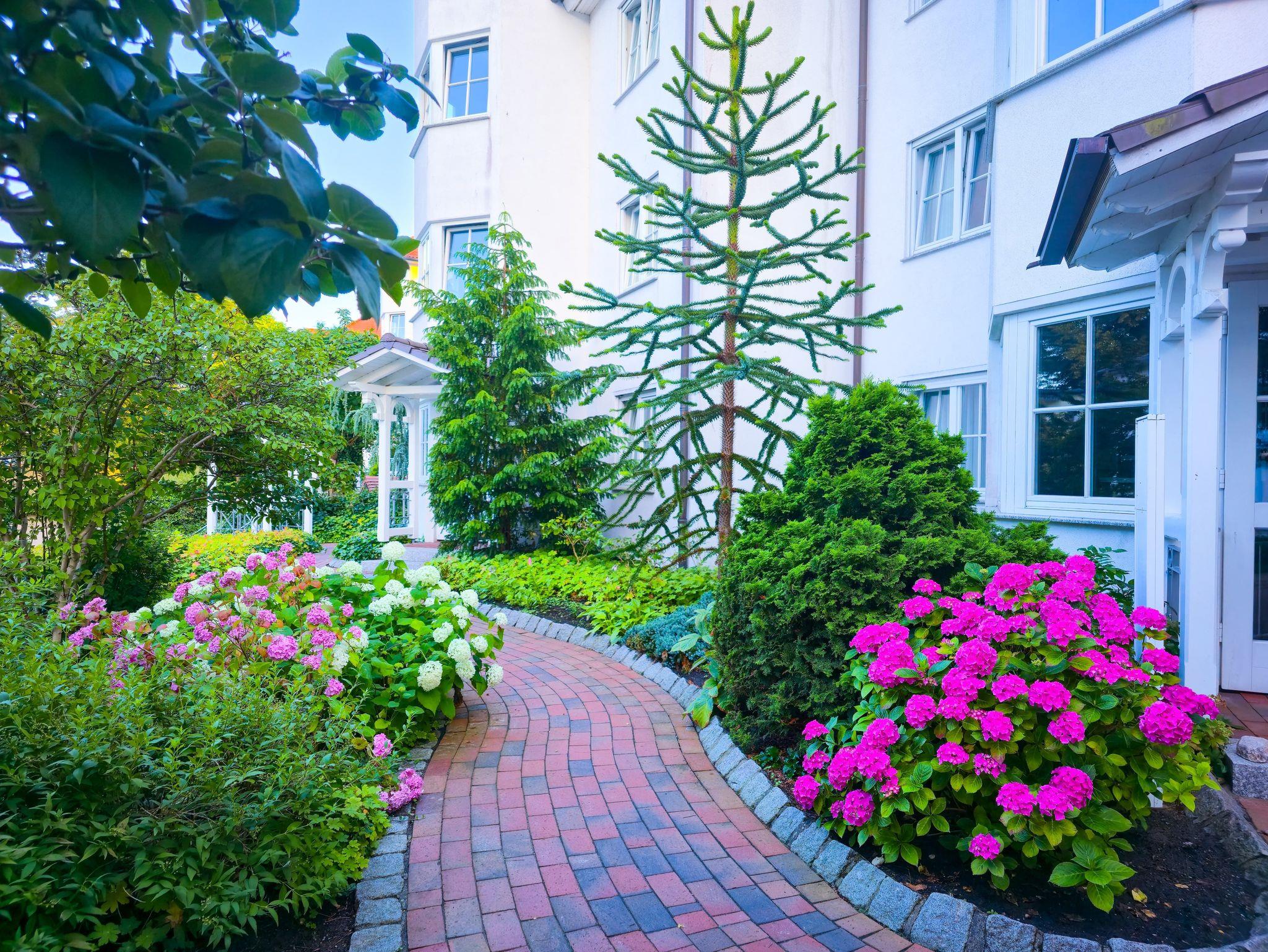 Die Ferienwohnungen liegen in einem kleinen Park mit altem Baumbestand und einem Gartenteich mit Springbrunnen. Bänke und überdachte Freisitze in den gepflegten Gartenanlagen laden zum Verweilen ein.