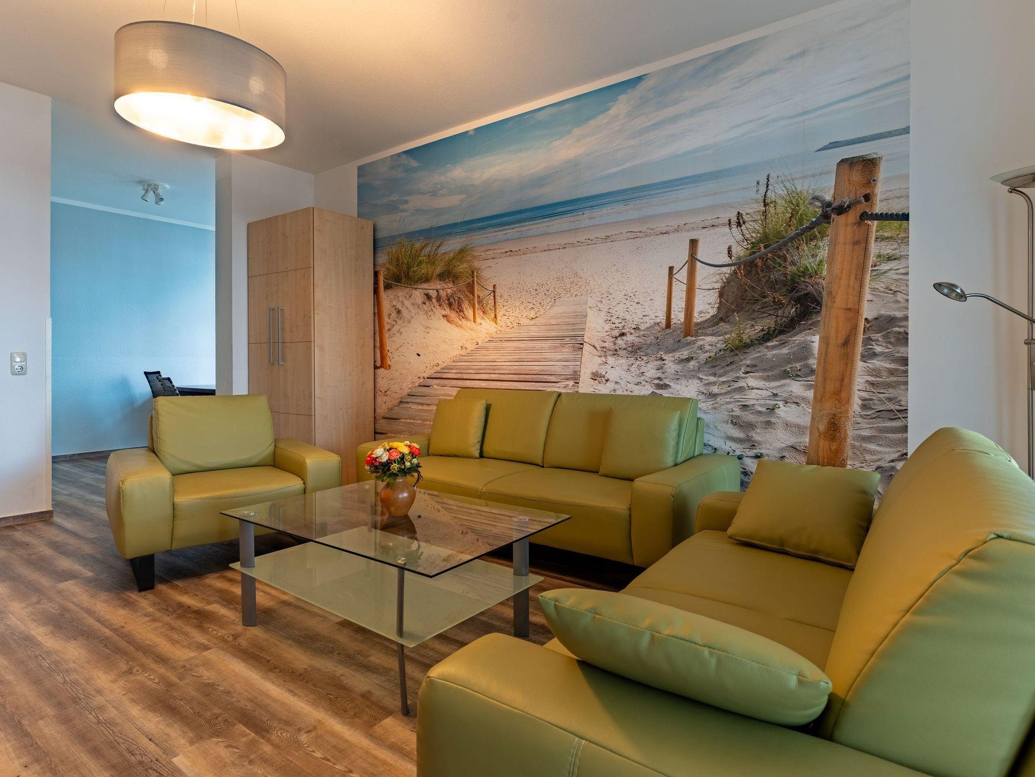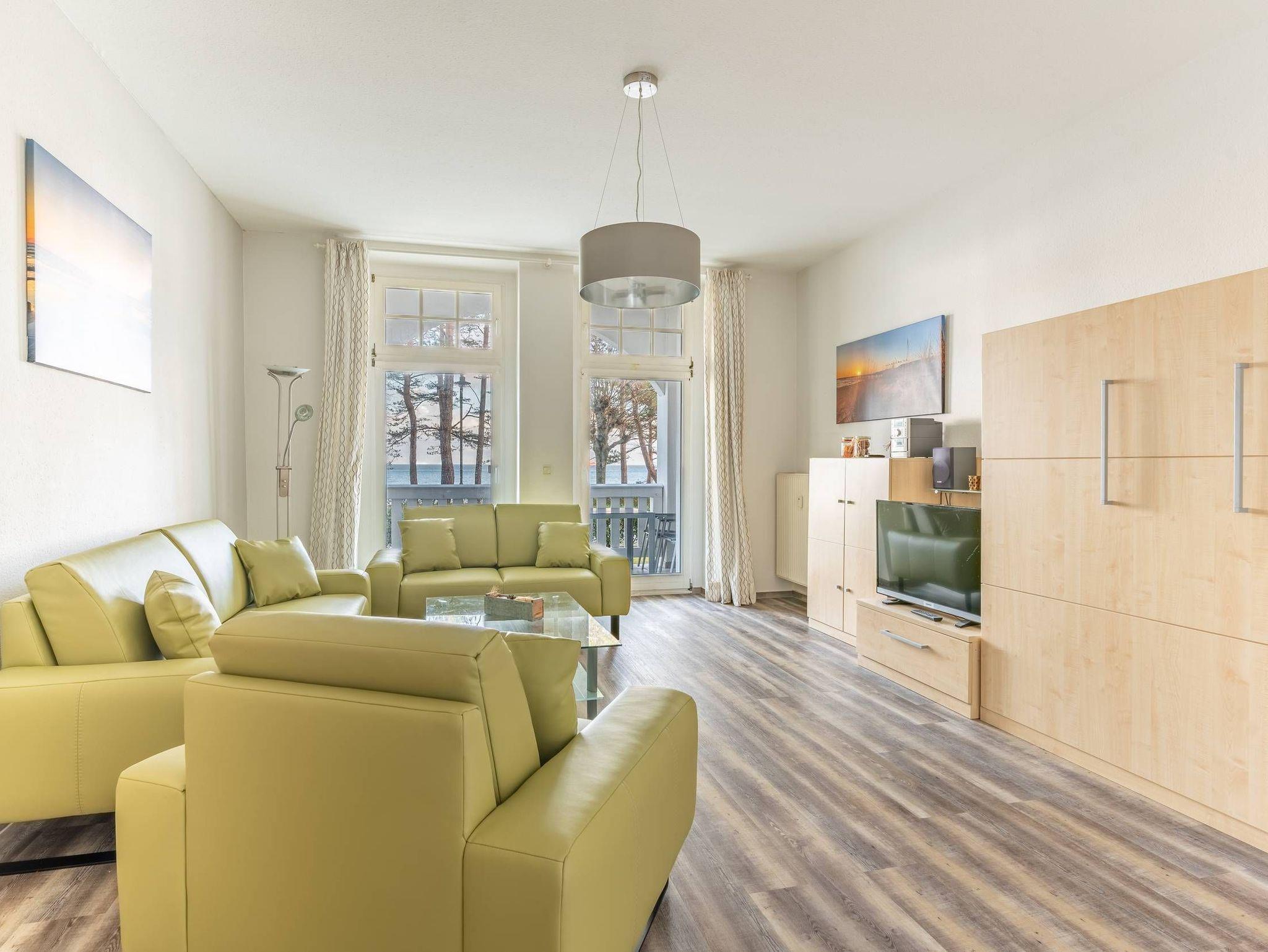 Vom Wohnzimmer aus erreichen Sie die beiden möblierten Balkone mit traumhaften Blick auf die Ostsee. Im Wohnbereich befindet sich ein Schrankbett, was mit wenigen Handgriffen zu einem vollwertigen Doppelbett ausgeklappt werden kann. Auf der Couch können Sie entspannt eine Urlaubstag vor dem Flat TV ausklingen lassen.