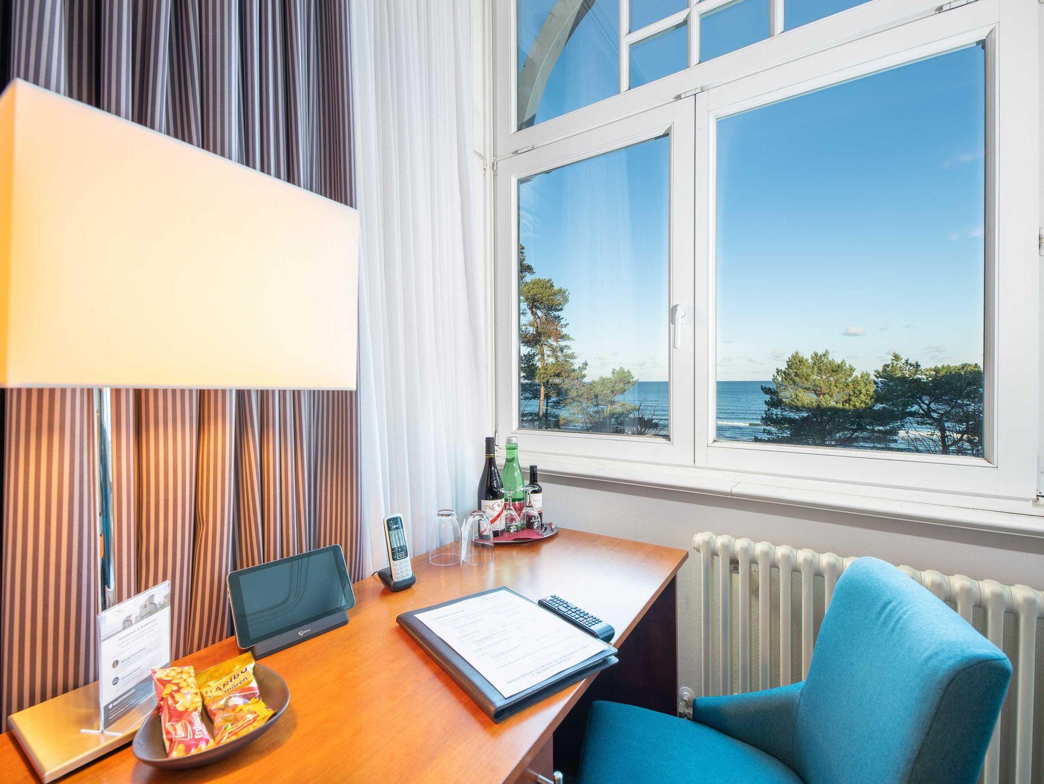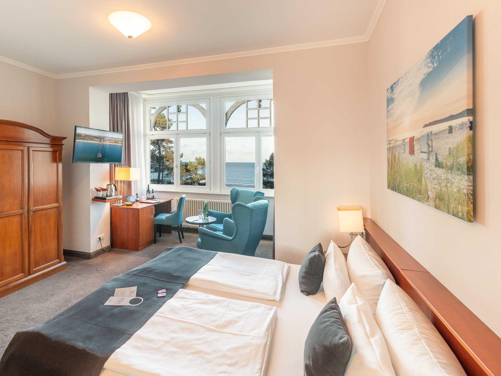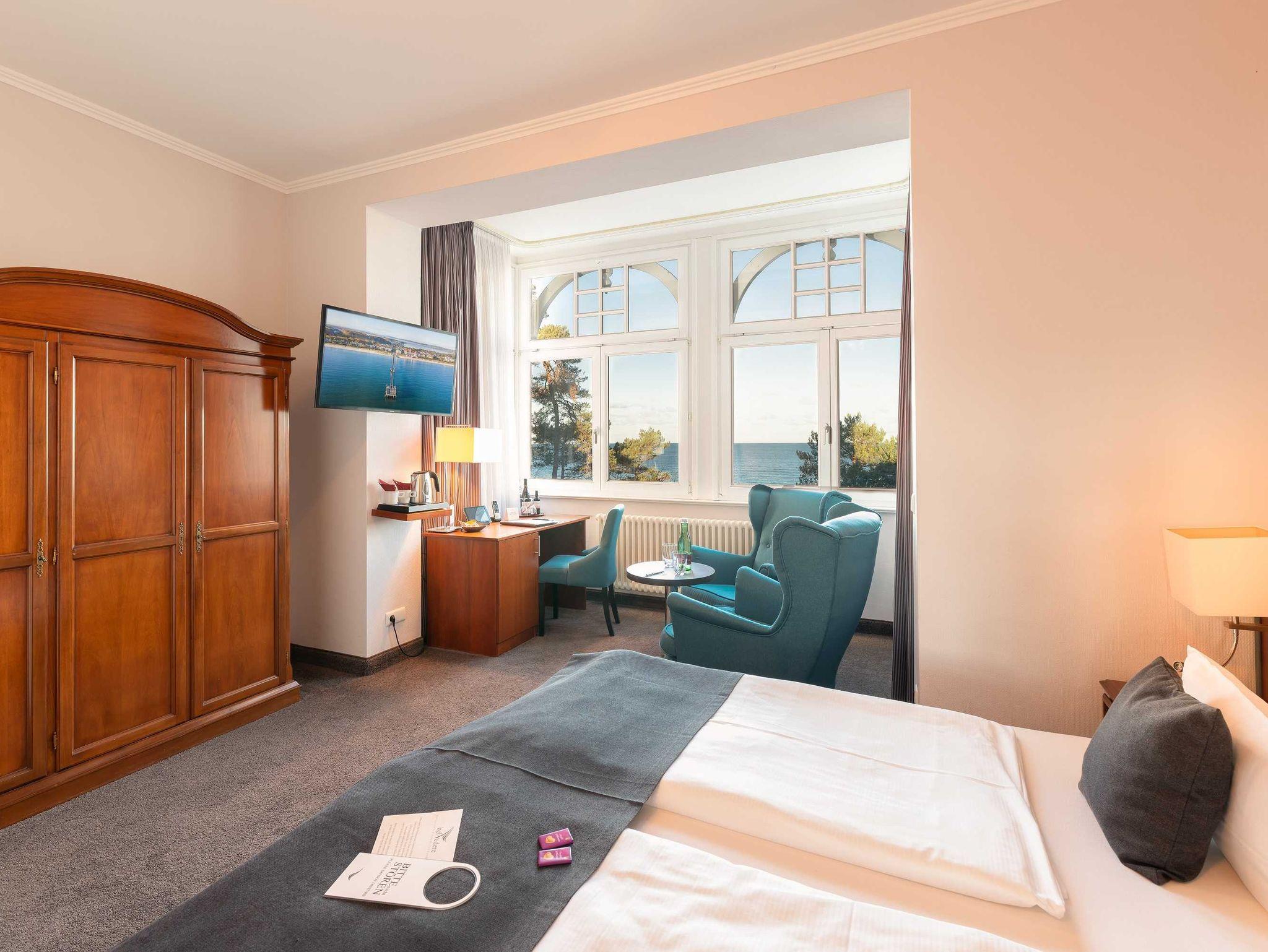 Alle unsere Zimmer sind liebevoll eingerichtet und bestechen mit einmaligem Komfort. Die modernen Bäder sind kleine Wohlfühl-Oasen mit viel Raum zur freien Entfaltung, alle Räumlichkeiten sind mit TV, Telefon, Zimmersafe und einer Minibar ausgestattet. Unsere mondänen Suiten verfügen außerdem über einen vollausgestatteten Küchenbereich sowie eine einladende Badewanne ? zum Träumen und Genießen. Besonders eindrucksvoll: Aus vielen unserer Doppelzimmer und Juniorsuiten haben Sie einen unvergesslichen Panoramablick auf die Ostsee.