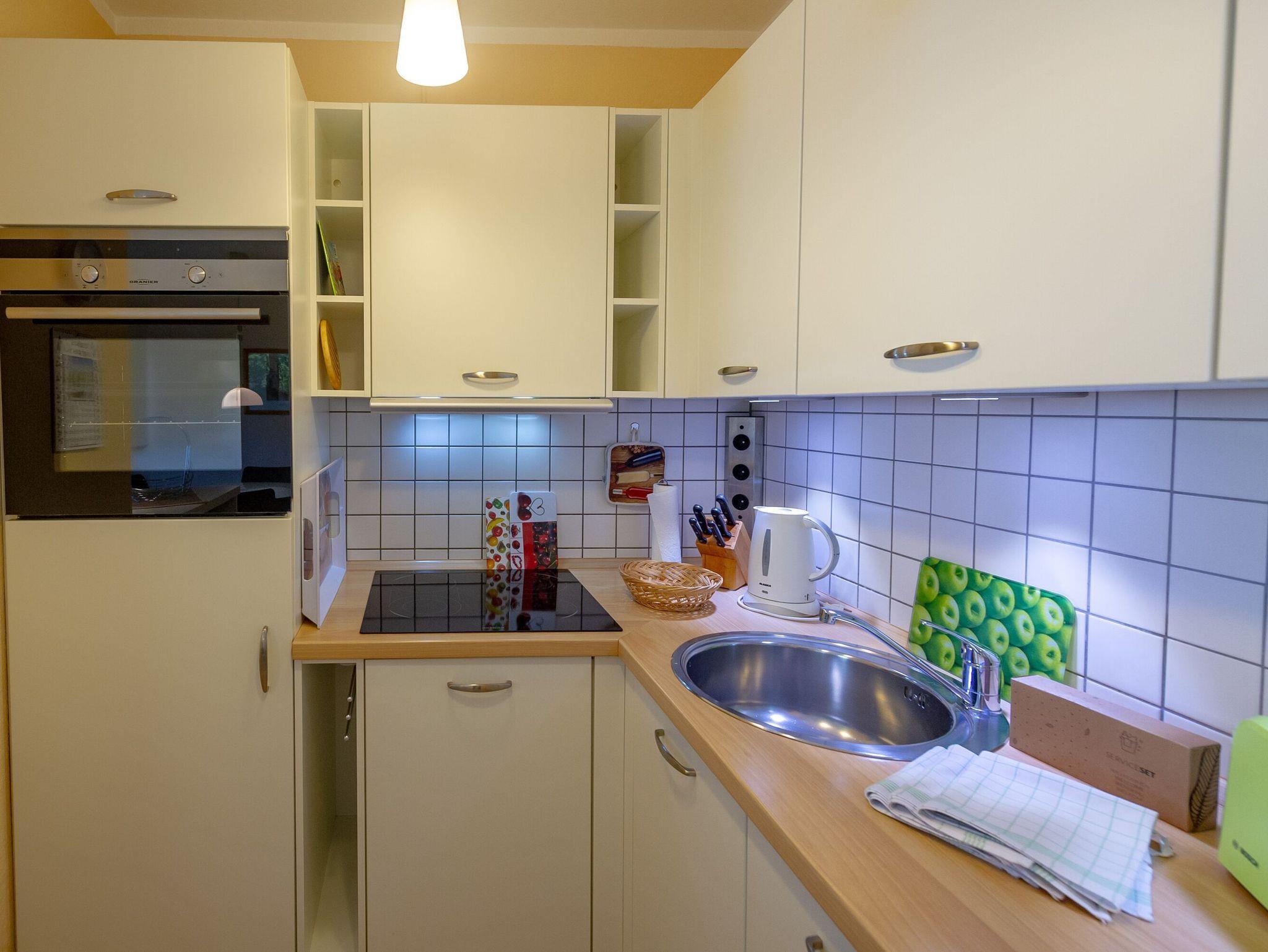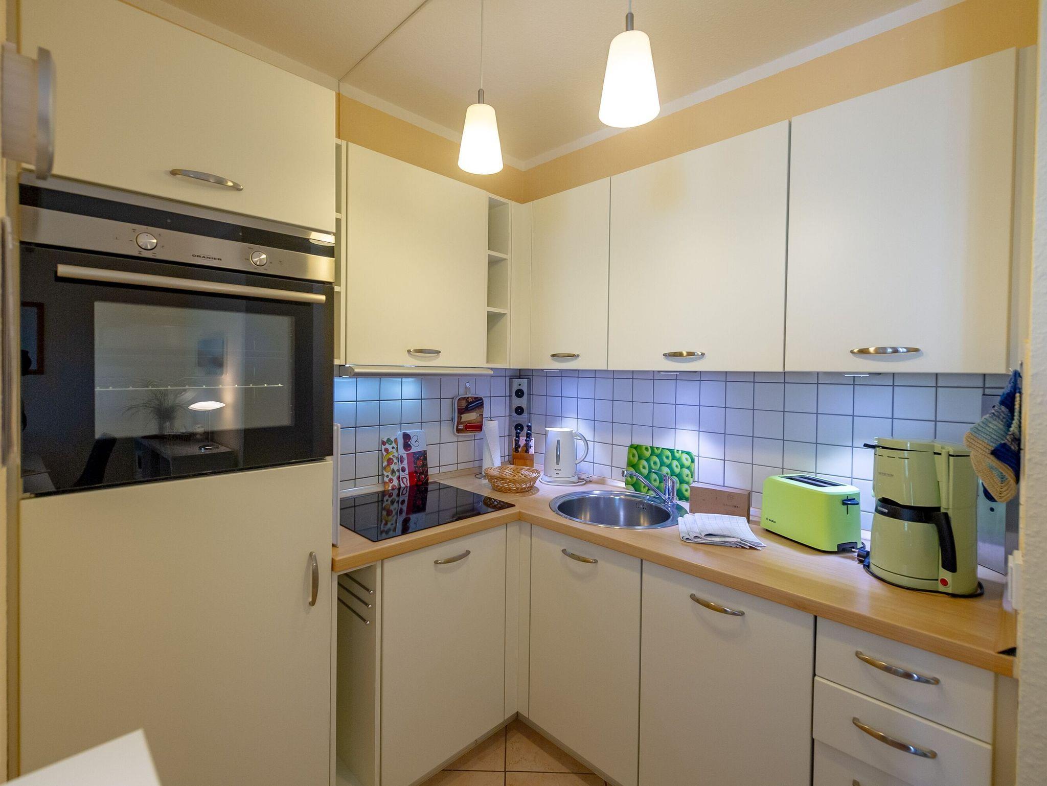Die Küchenzeile ist komplett ausgestattet mit allem, was man zum Kochen braucht - inklusive Kühlschrank mit Gefrierfach, Backofen, Induktionsherd und Spülmaschine. Und falls Sie mal keine Lust zum Kochen haben, kein Problem! Den Bäcker erreichen Sie in drei Minuten zu Fuß, Cafés und Restaurants in nur sechs Minuten.