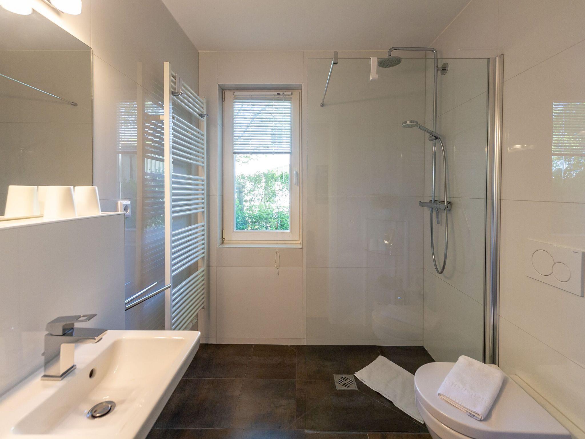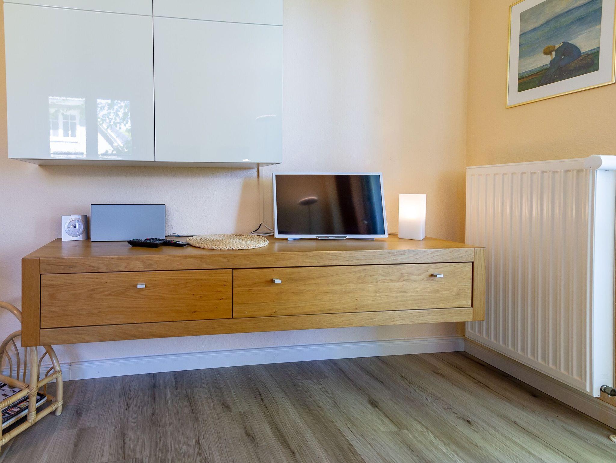 Im Schlafzimmer erwartet Sie ein großes, bequemes Doppelbett und ein geräumiger Kleiderschrank, der viel Platz für Ihre Garderobe bietet. Ein zweiter Fernseher sorgt für zusätzlichen Komfort. Das moderne Tageslichtbad überzeugt mit einer ebenerdigen Dusche, WC, einem beleuchteten Waschtisch inklusive Fön und Kosmetikspiegel sowie einem beheizbaren Handtucktrockner.