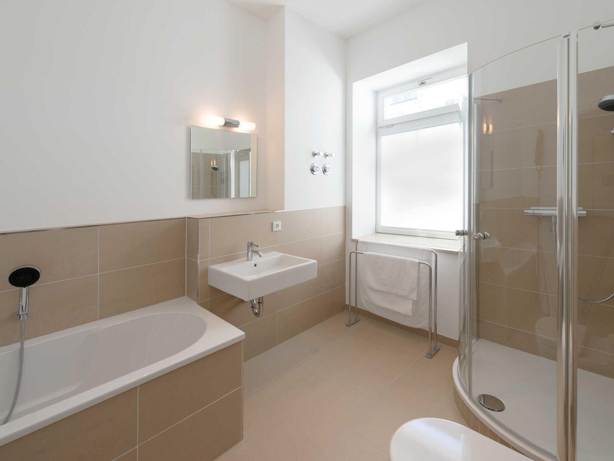 Umfassende Küchenausstattung mit Siemens-Herd mit Ceran-Feldern und Backofen, Siemens-Kühlschrank mit Tiefkühlfach, Siemens-Geschirrspüler, Toaster, Wasserkocher, Kaffeemaschine sowie umfassenden zusätzlichen Küchenutensilien (Reibe, Knoblauchpresse, uvm.), zwei Badezimmer: Eins mit Badewanne und Dusche / WC; ein weiteres Bad mit Dusche / WC.
