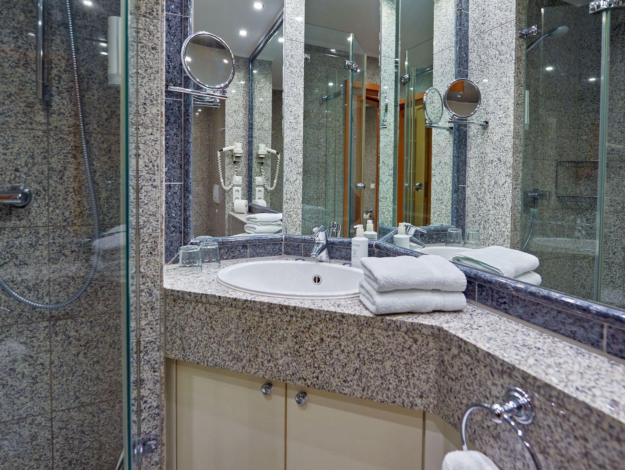 Das mit wertvollen Granitfliesen und großen Spiegelflächen ausgestattete Bad verfügt über eine geräumige Dusche, ein WC, einen beleuchteten Waschtisch sowie Kosmetikspiegel und Fön.
