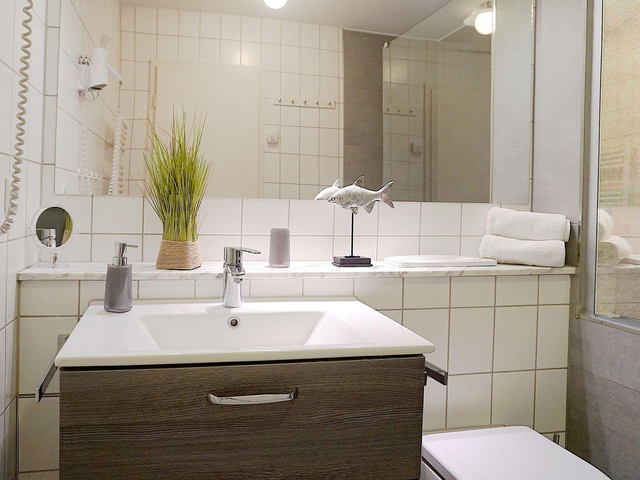 · hochwertiges Bad mit bodenebener Wellnessdusche (Regenschauer und Handbrause), fest installiertem Fön