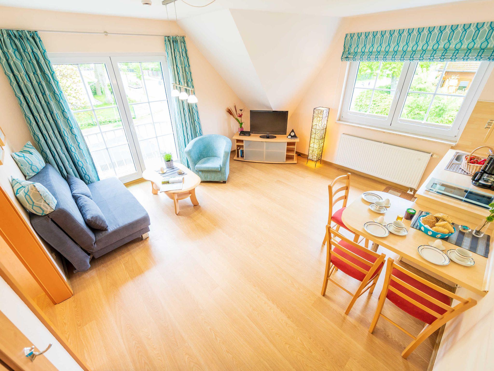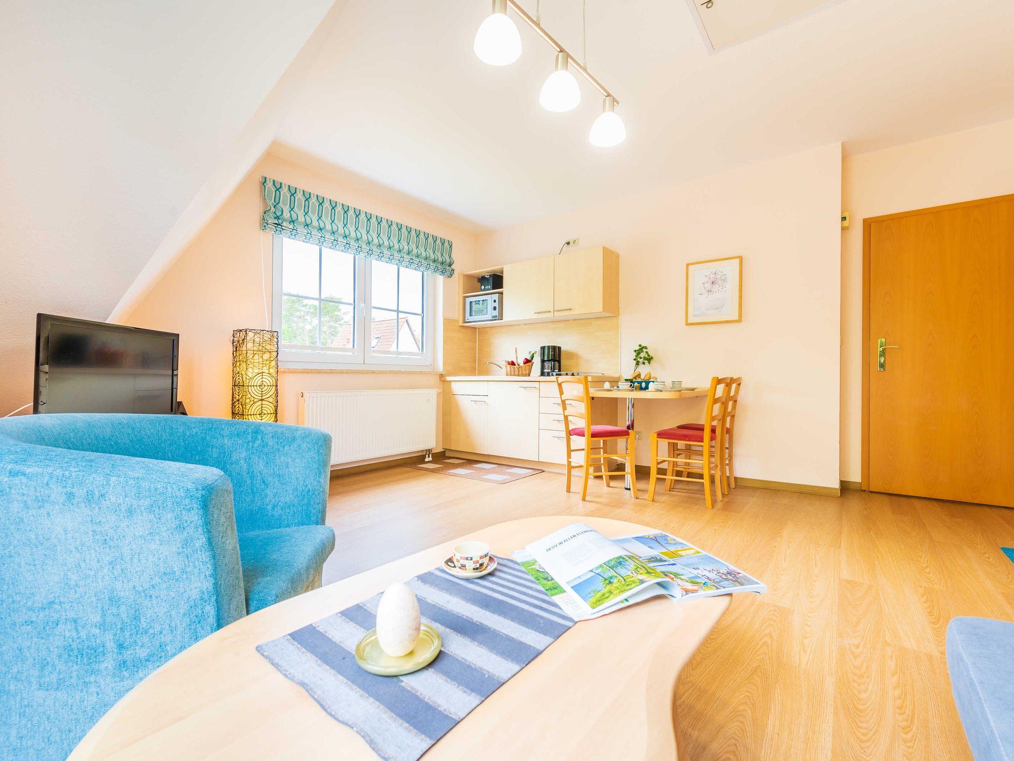 Das Nichtraucher-Appartement 1 im 1.OG/DG, ist individuell sehr wohnlich und gemütlich eingerichtet. Die ca 30 m² große Wohnung ist für max. 2 Personen ausgerichtet und verfügt über einen Wohnraum und Schlafraum sowie DU/WC. Im Wohnbereich befindet sich eine bequeme Couch und Sessel ,TV, Eßbereich sowie eine kleine Küchenzeile ausgestattet mit 2-Platten Cerankochfeld,Kühlschrank,Microwelle und diversen Kleingeräten. Schlafraum mit Boxspringbett (1,60m x 2.00m) und Kleiderschrank. Terrasse zur gemeinsamen Nutzung. PKW-Stellplatz auf dem Grundstück. Fahrräder können in der abschließbaren Garage untergebracht werden.