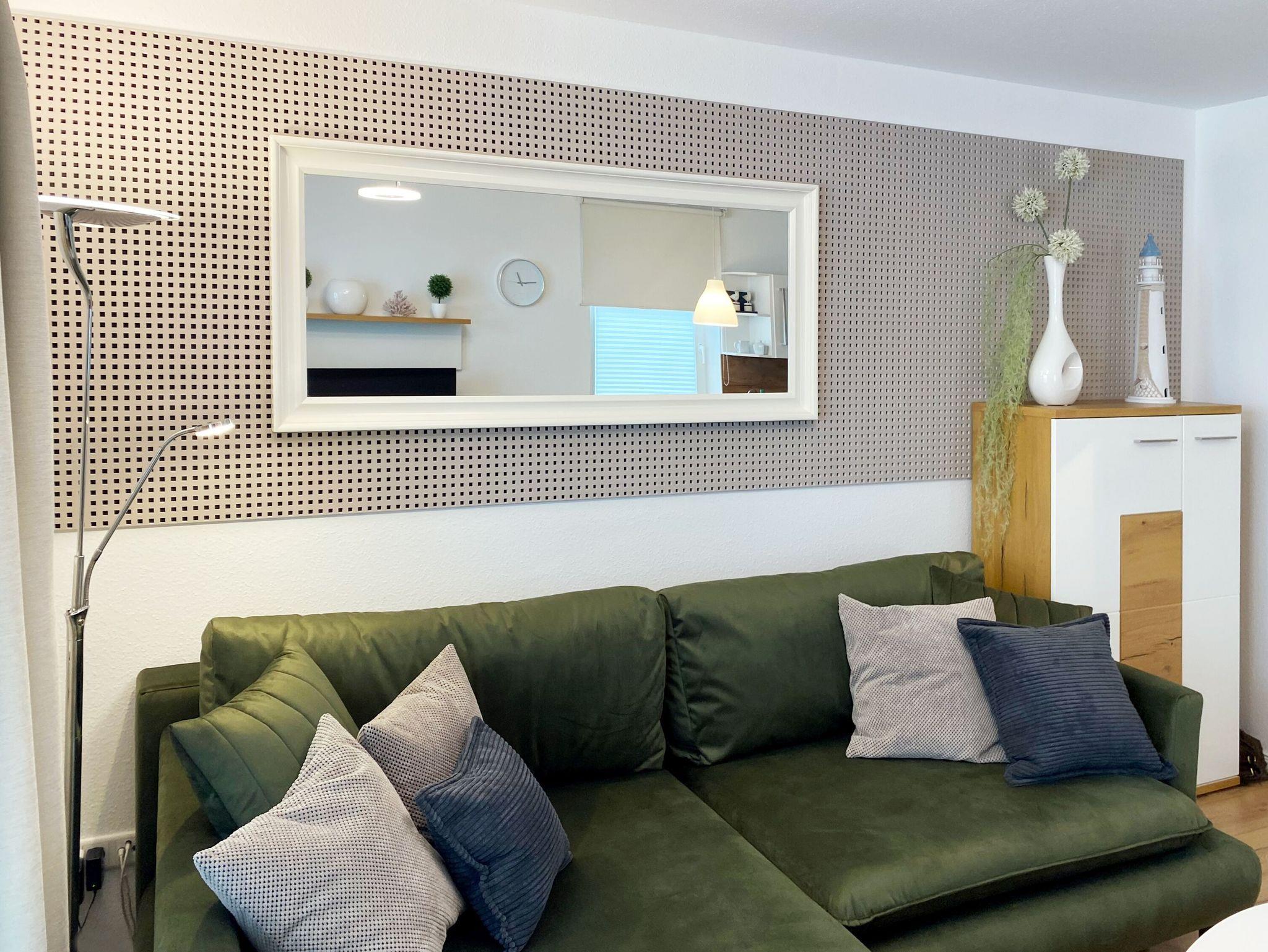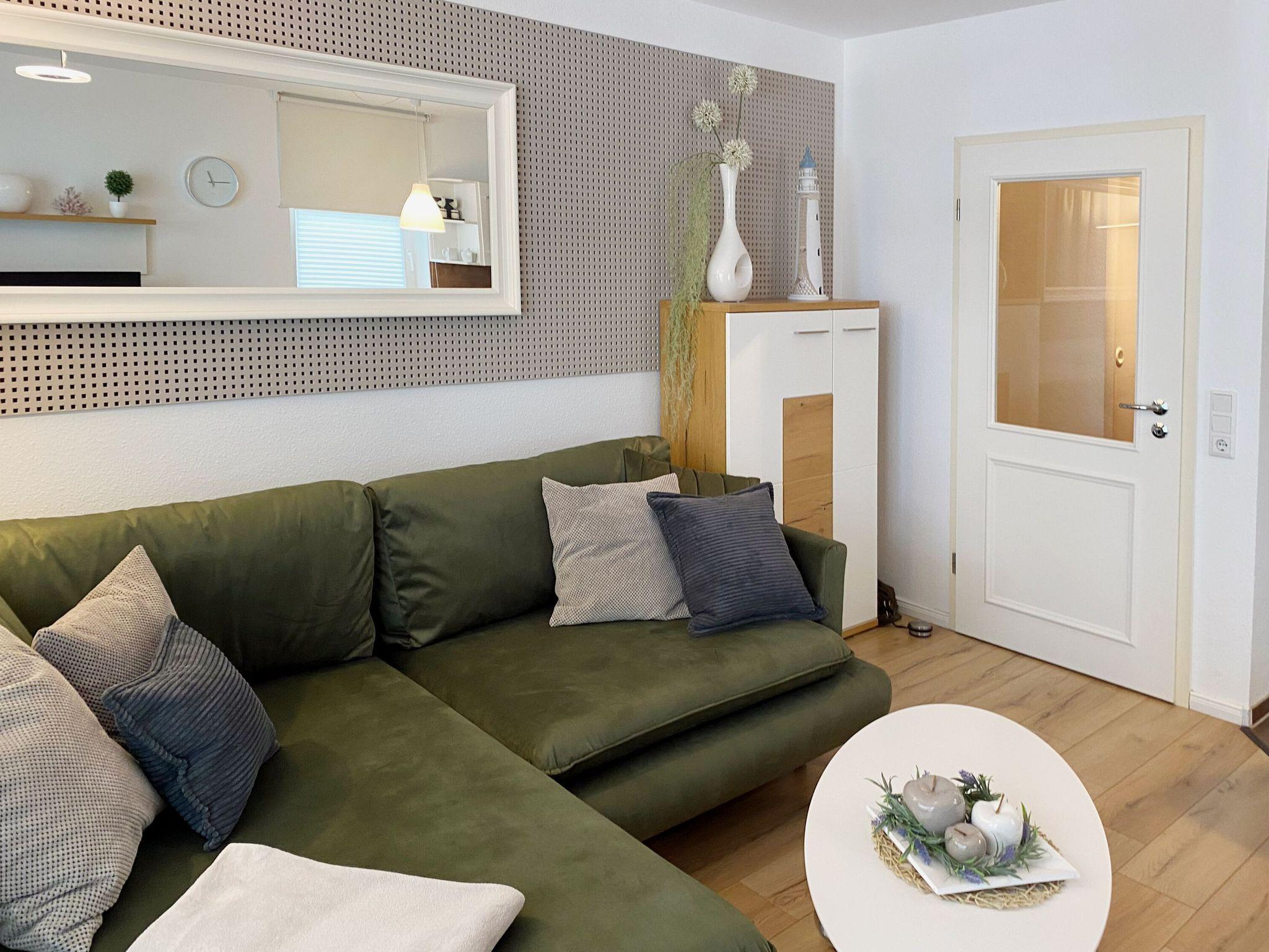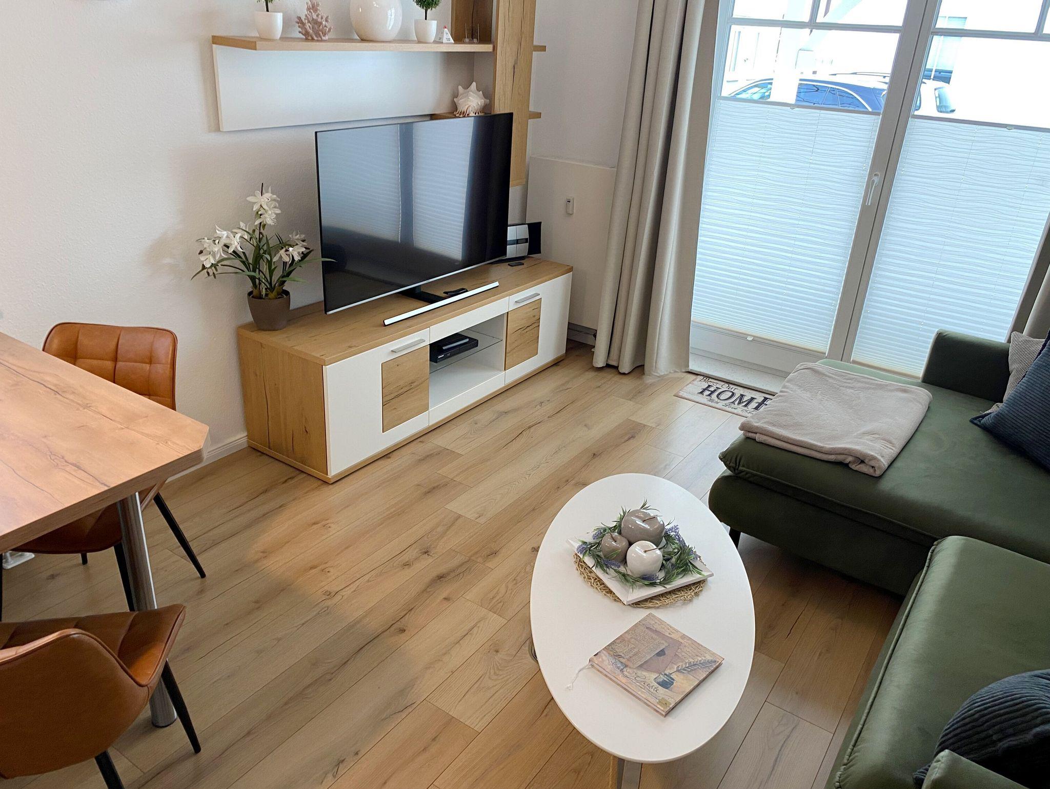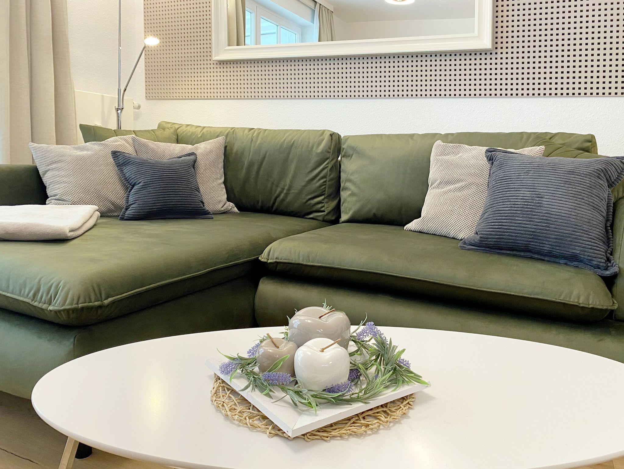 Vom Eingangsflur mit der Garderobe aus gelangen Sie in den geräumigen und modern ausgestatteten Wohnbereich mit einer gemütlichen Eckcouch, einem großem Flachbild-TV, einer Musikanlage, einem CD- und BlueRay-Player sowie einem Esstisch. Ein kostenfreier WLAN-Anschluss ist selbstverständlich ebenfalls vorhanden.