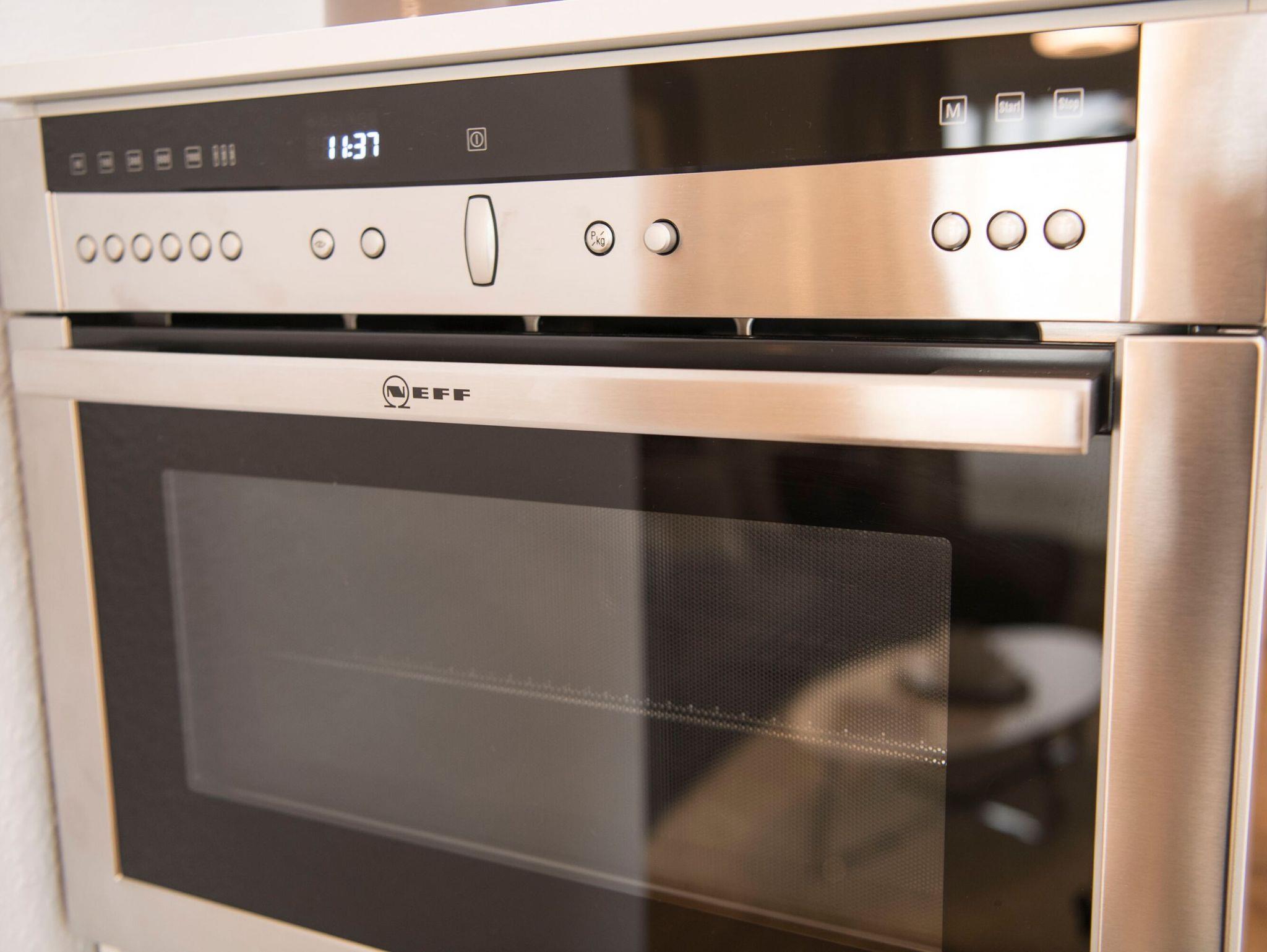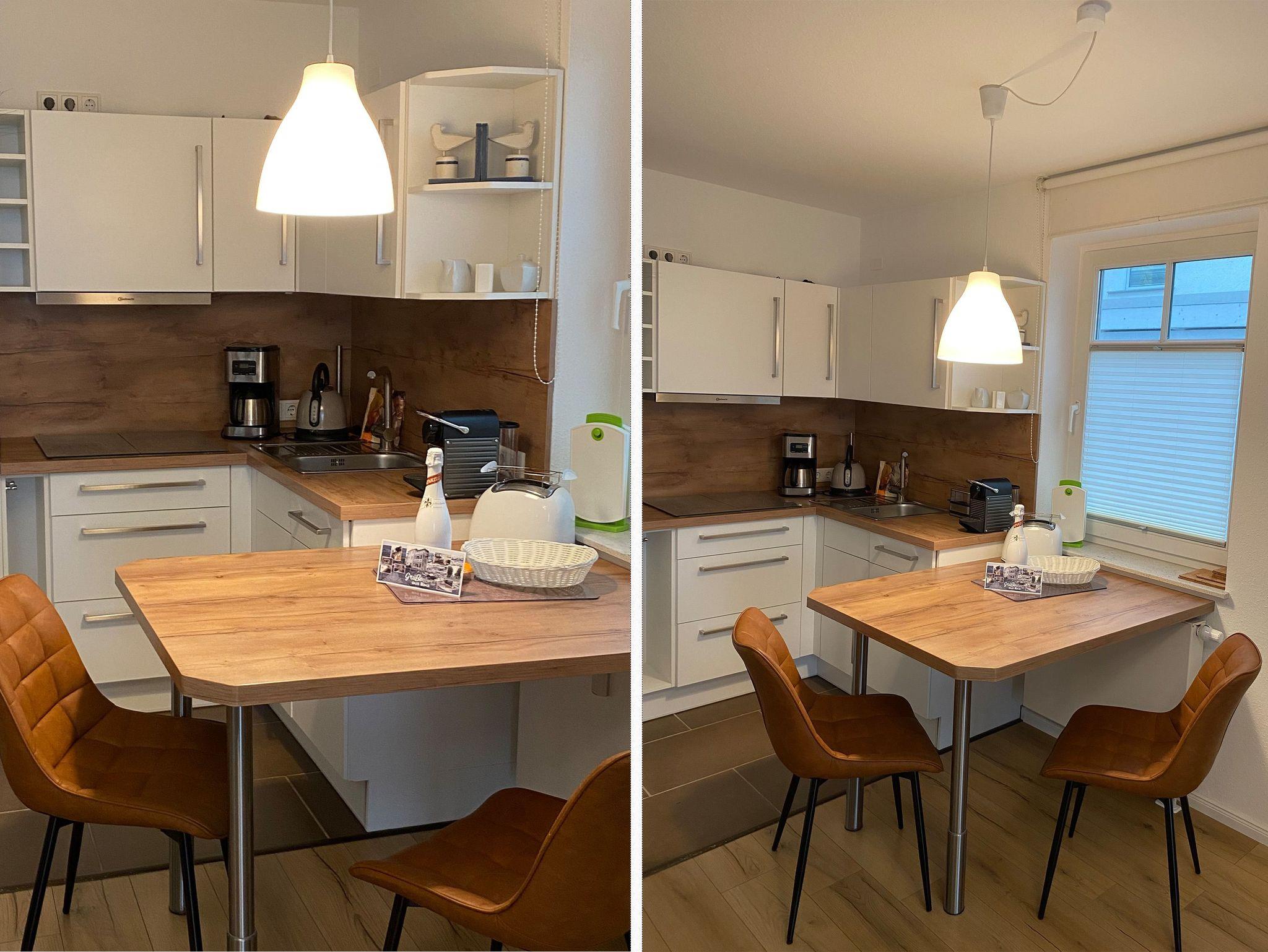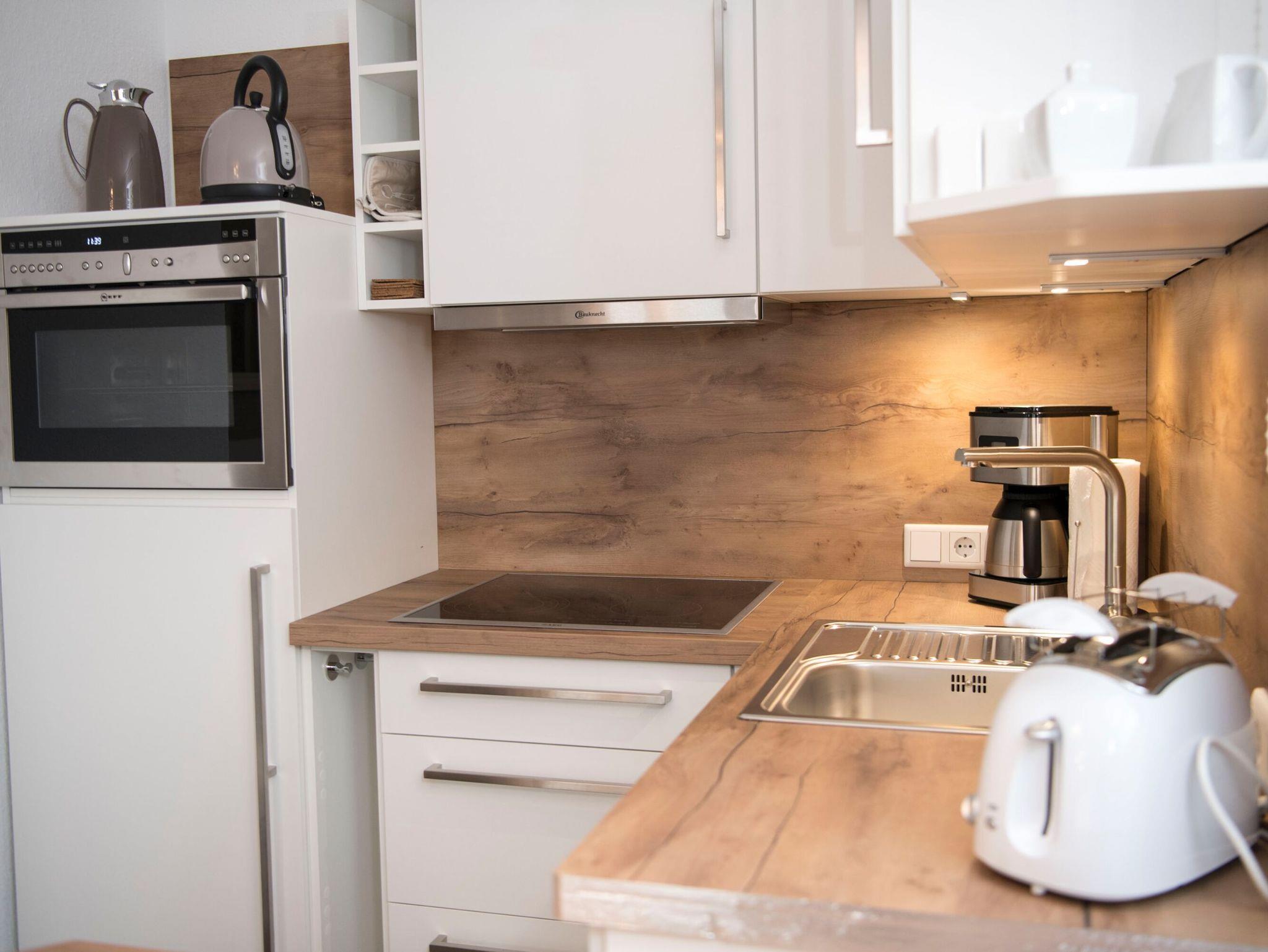 Die Küchenzeile fügt sich harmonisch in den Wohnbereich ein. Hier finden Sie einen Kühlschrank mit Gefrierfach, ein 4-Platten-Ceranfeld, eine Spülmaschine, eine Kaffeemaschine, einen NESPRESSO-Automat, einen Toaster sowie einen Wasserkocher und diverses Kleininventar, welches die Küchenausstattung komplettiert. Dazu gibt es einen Backofen in Komforthöhe mit integrierter Mikrowellenfunktion.