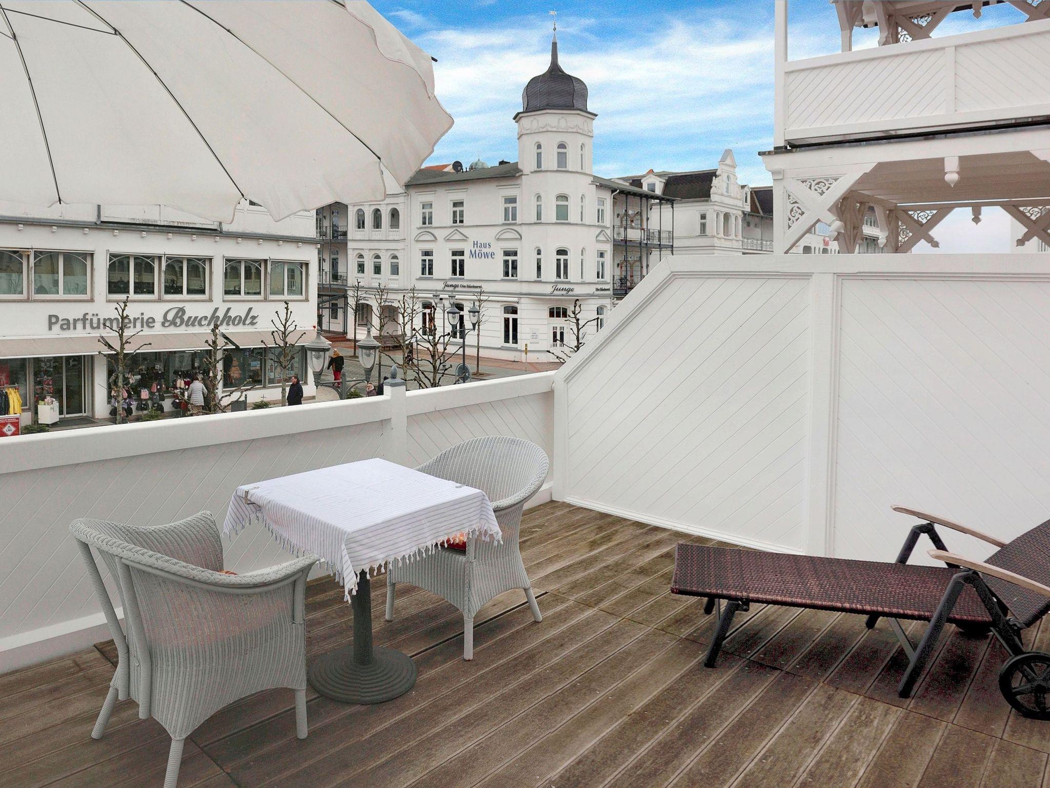 Auf den Balkon gelangen Sie vom Schlafzimmer aus. Hier können Sie nach einem erlebnisreichen Tag am Abend die untergehende Sonne genießen und am Leben in der Fußgängerzone teilhaben.