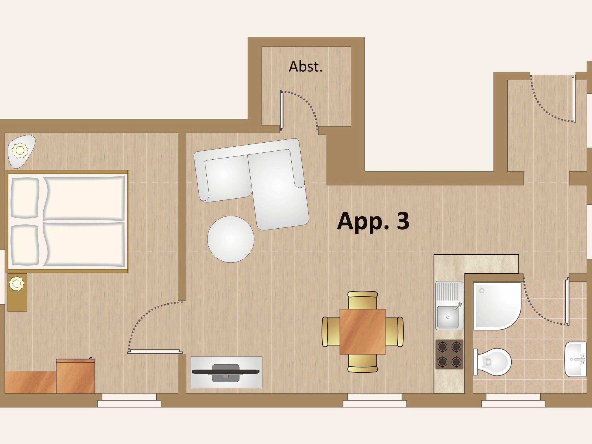 Das Appartement Nr.1 befindet sich im 1. Obergeschoss und bietet bei einer Größe von ca. 52 qm (inkl. Balkon) Platz für 2 bis 3 Personen. Es ist aufgeteilt in ein kombiniertes Wohn- und Esszimmer mit gemütlicher Sitzecke, Sat-TV und Radio. Die intergrierte Küchenzeile ist komplett ausgestattet mit Ceran-Herd, Backofen, Mikrowelle, Kühlschrank, Geschirrspülmaschine und allen möglichen Küchenutensilien. Eine separate Essecke ist ebenso vorhanden. Im Schlafzimmer befinden sich ein Doppelbett und ein großer Kleiderschrank. Das Bad ist ausgestattet mit Dusche und WC.