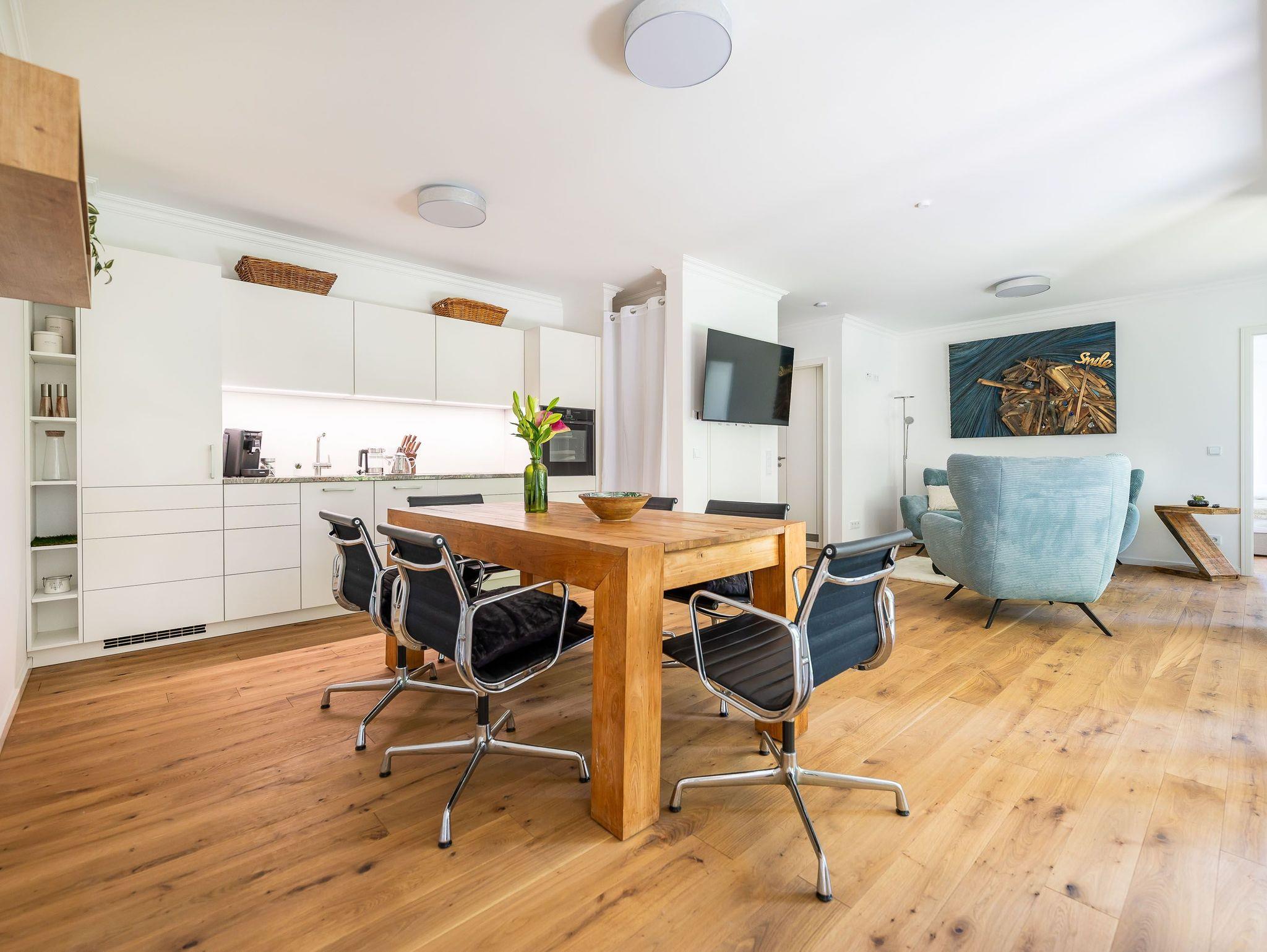 Nichtraucher-Appartement, bodentiefe Glaselemente, Fußbodenheizung in allen Räumen, Echtholzboden (Landhausdielen), Holz- & Strukturfliesen in den Duschbädern, bodentiefe Fenstter, Schiebelemente im Wohnbereich zum Balkon, elektrische Rolläden, kostenloses WLAN, maßangefertigte Leichtküche, Geräte von Neff, Senseo Café Maschine, Geschirrspülmaschine, Wasserkocher, Teebereiter u.v.m. - und eine kleine Überraschung vom Eigentümer als Willkommensgruß.