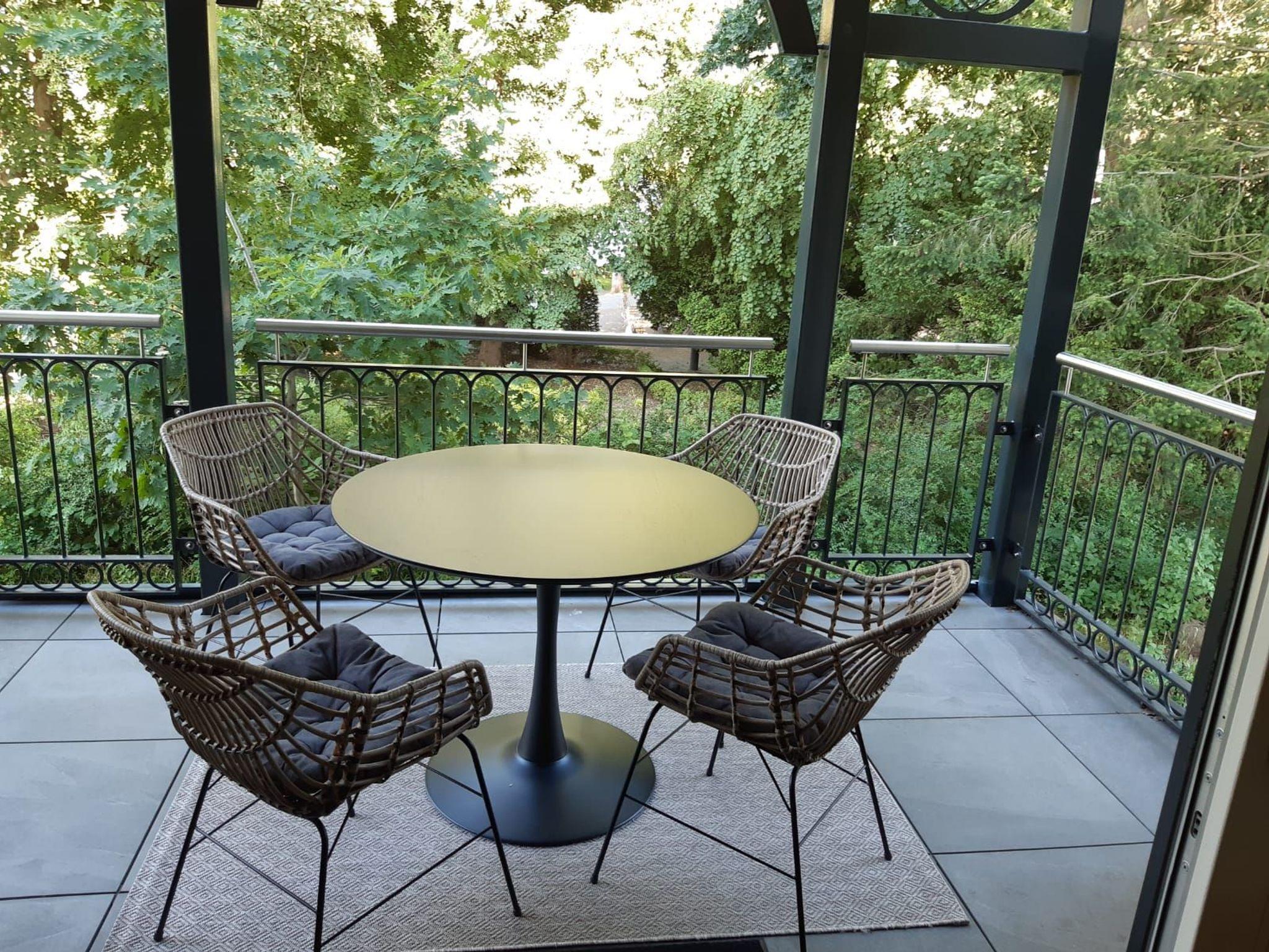 Ein weiteres Schmuckstück ist der Balkon mit traumhaften Blick ins Grüne des Kurparkes. Der überdachte Balkon ist vom Wohn-/Essbereich begehbar. Passende, gemütliche Terrassenmöbel für 4 Personen laden zu gemütlichen Stunden ein. Selbst wenn das Wetter mal nicht freundlich mitspielen sollte. - Süd-Ost-Ausrichtung!