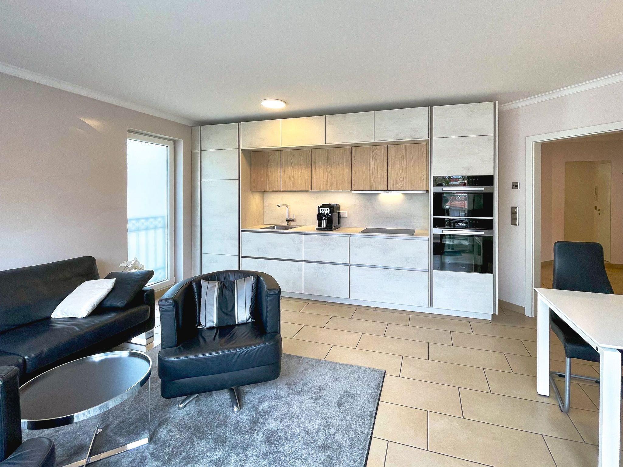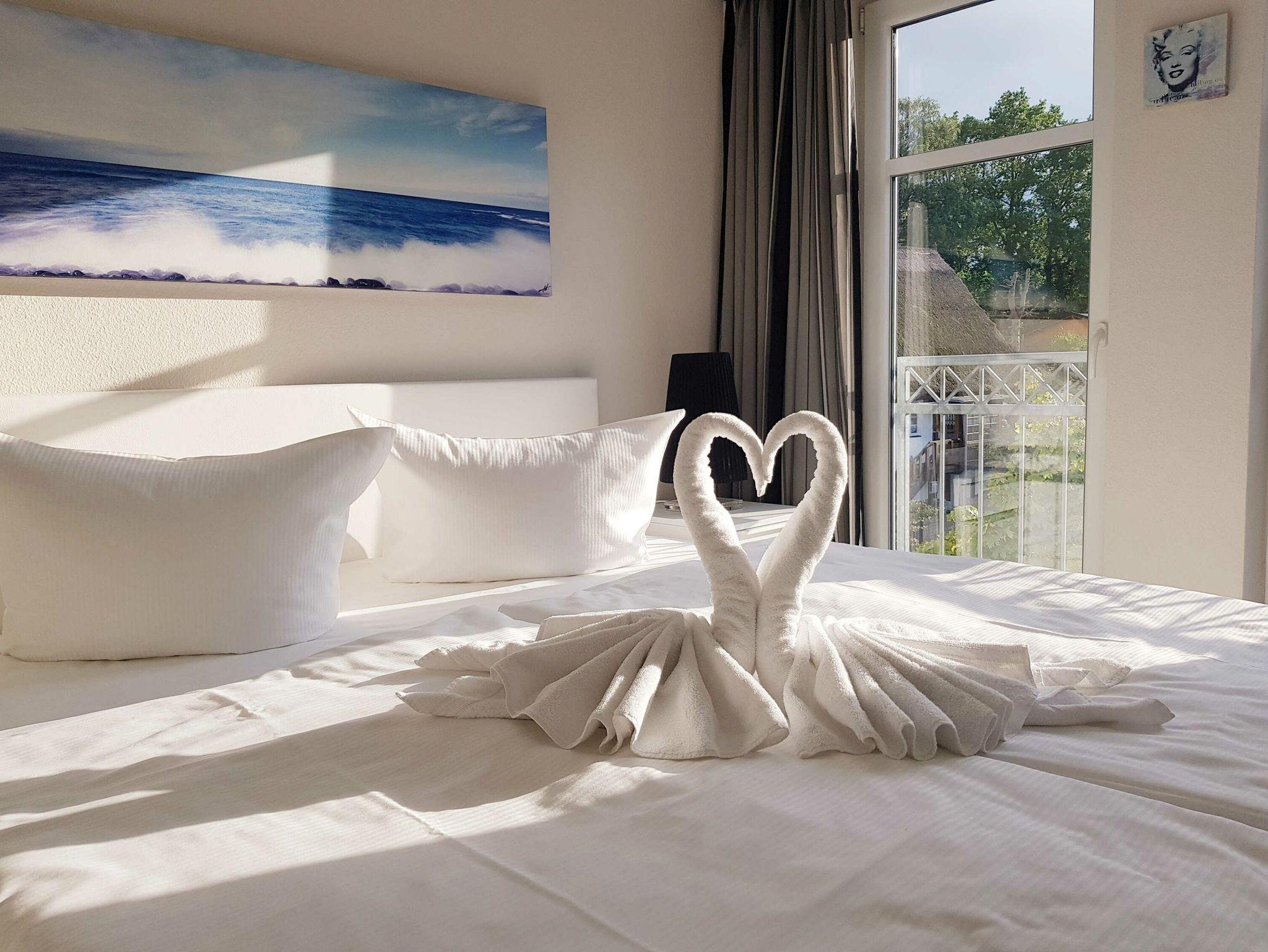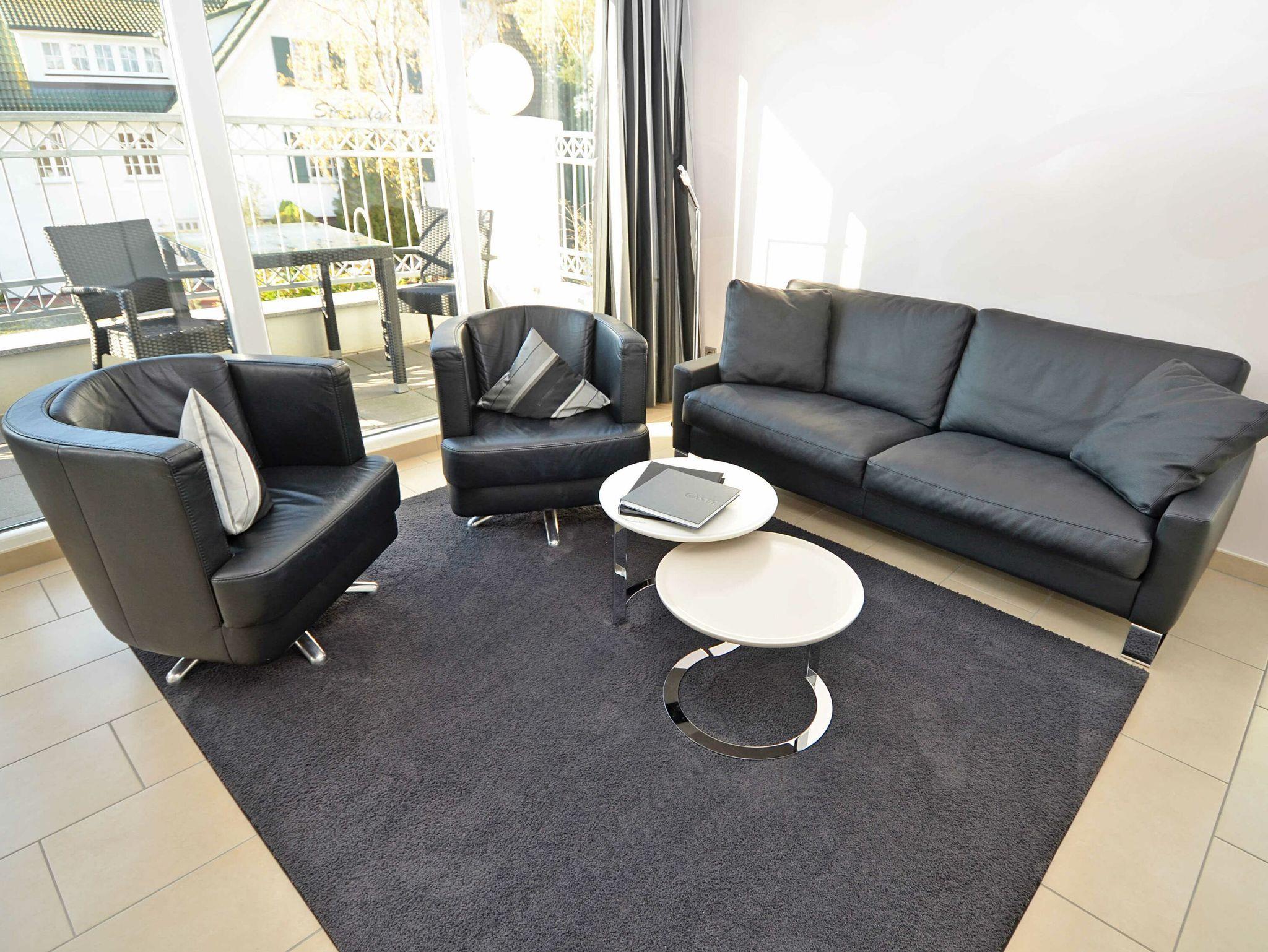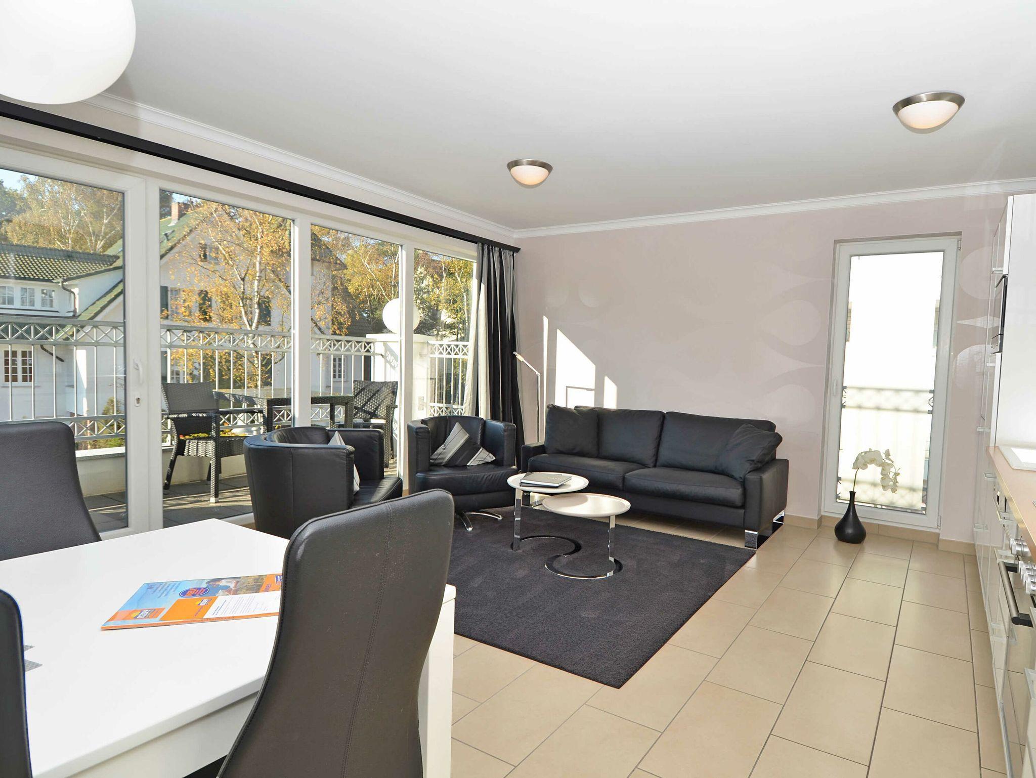 Dieses 58 m² große und exklusiv eingerichtete 3-Raum-Appartement Meeresbrise befindet sich im 1. Obergeschoss des zweistöckigen Hauses und hat einen 8 m² großen möblierten Süd-Balkon, der vom Wohnzimmer aus zu betreten ist.