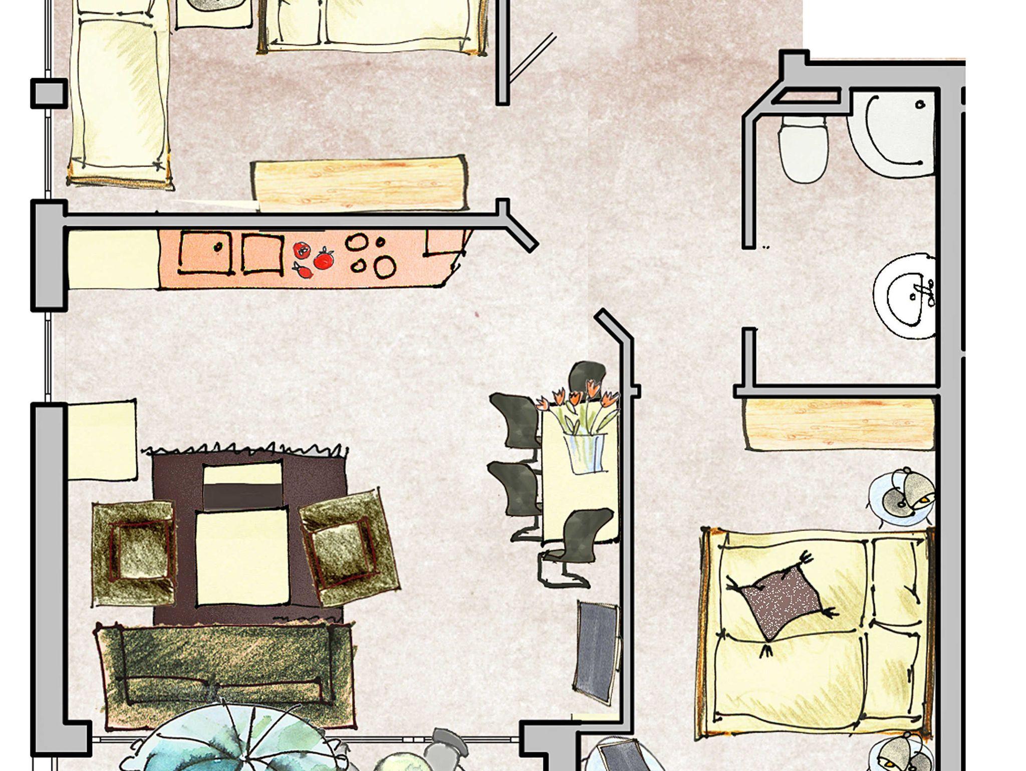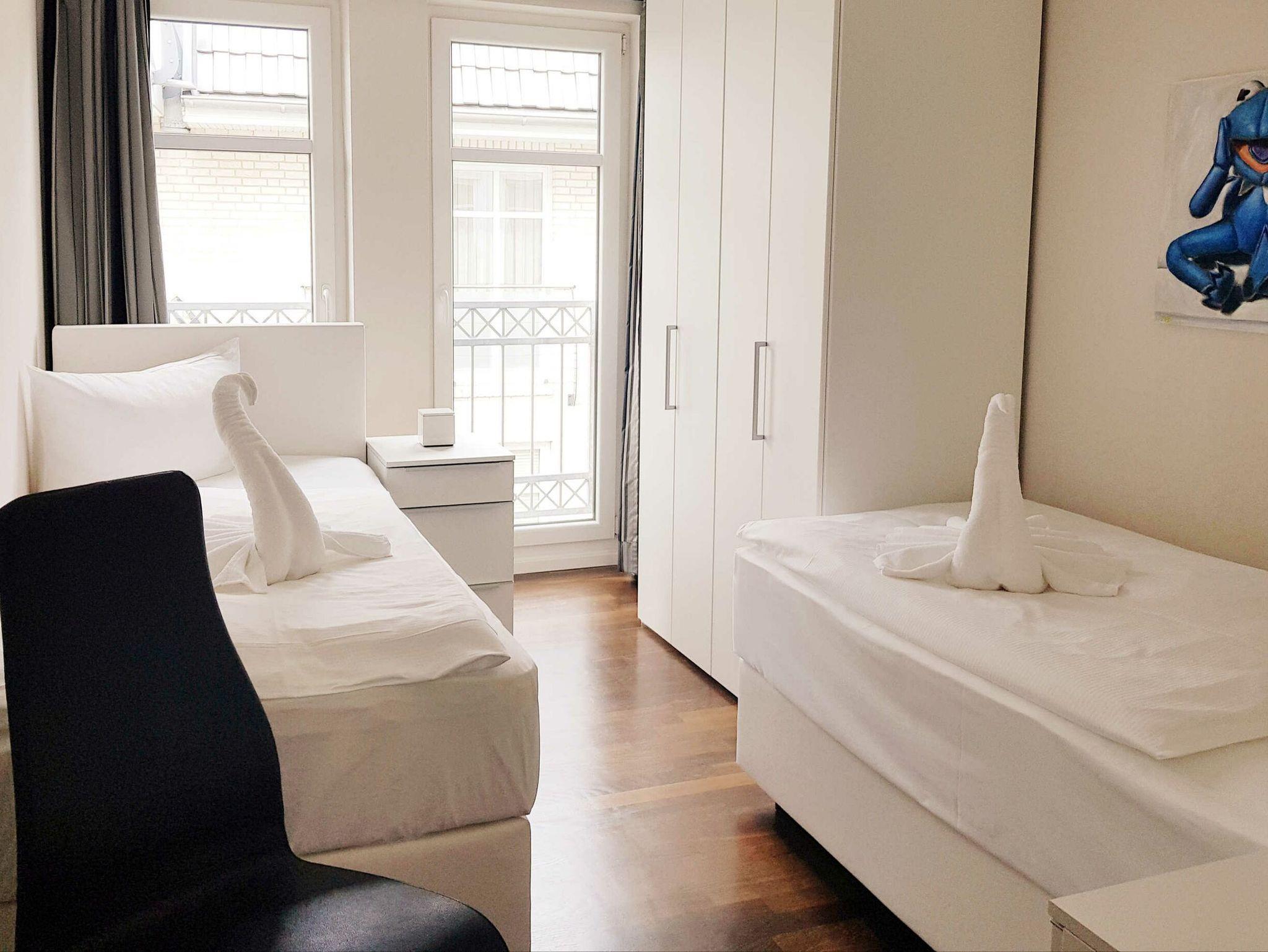 Die Nichtraucherwohnung ist teilweise gefliest und mit einer Fußbodenheizung versehen. In den Schlafzimmern befinden sich Wenge-Parkettböden. Eines der Schlafzimmer ist mit einem Boxspring-Doppelbett (1,80 x 2,00 m) mit durchgehendem Topper), einem eigenen TV und einem Laptop-Tresor ausgestattet. Das zweite Schlafzimmer verfügt über zwei Boxspring-Einzelbetten (0,90 x 2,00 m).