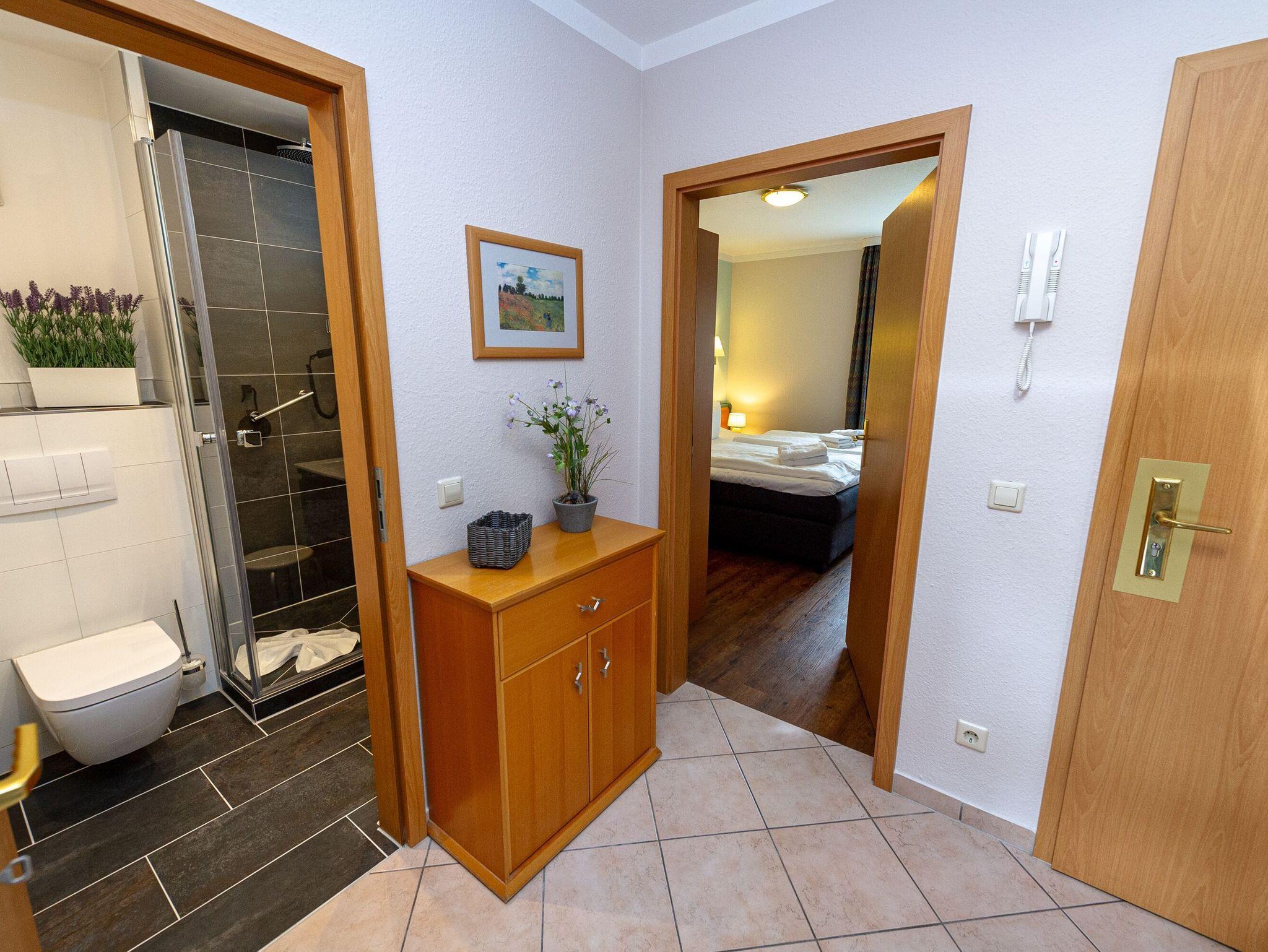 Weiterhin gibt es ein Schlafzimmer mit einem bequemen Boxspringbett (1,80 x 2,00 m), einem zweiten Fernsehgerät und ausreichend Platz für Ihre Garderobe sowie ein modernes Badezimmer mit Dusche/WC.