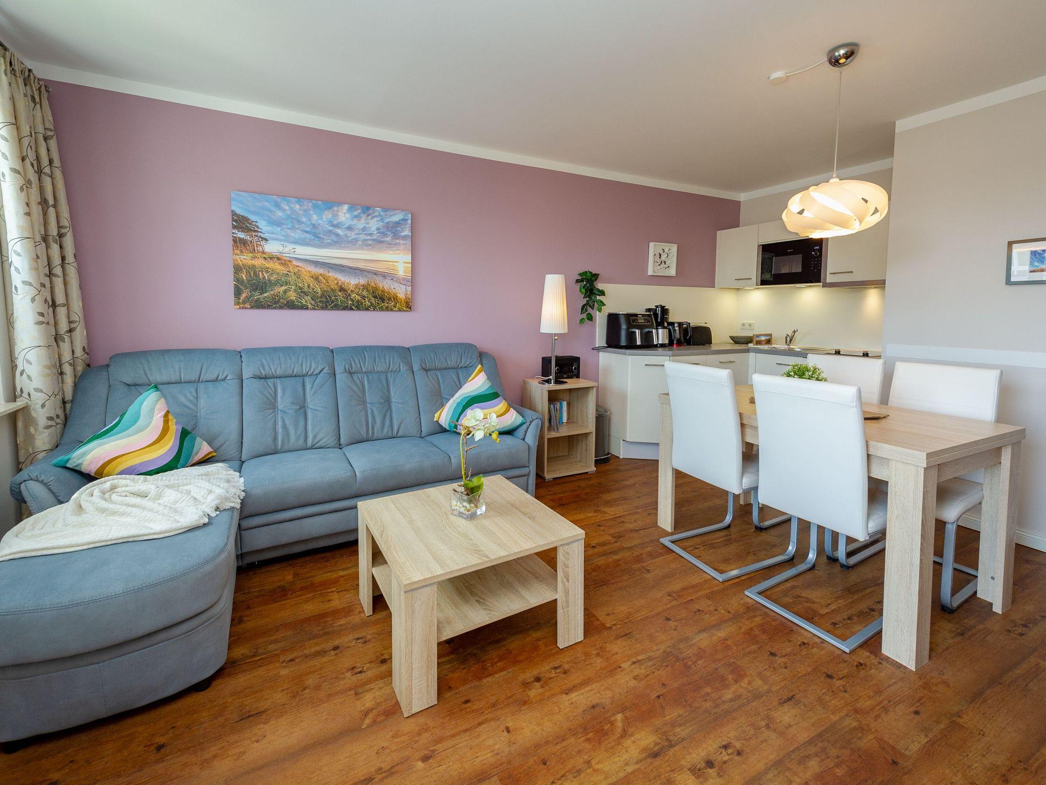 Der Wohnraum verfügt über einen Esstisch und eine Schlafcouch (Aufbettungsmöglichkeit für eine Person), eine Mini-Stereoanlage mit CD-Player, einen Flachbild-TV und die offene Küche. Diese ist ausgestattet mit einem Kühlschrank mit Gefrierfach, einer Mikrowelle, einen 2-Zonen-Herd, Wasserkocher, Kaffeemaschine, Toaster und diversem Kleininventar, das die Küchenausstattung komplettiert.