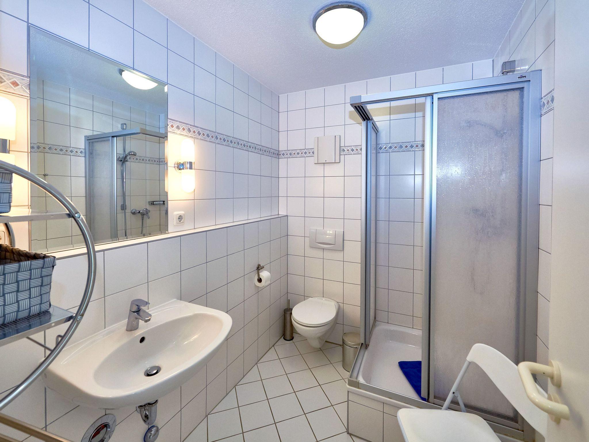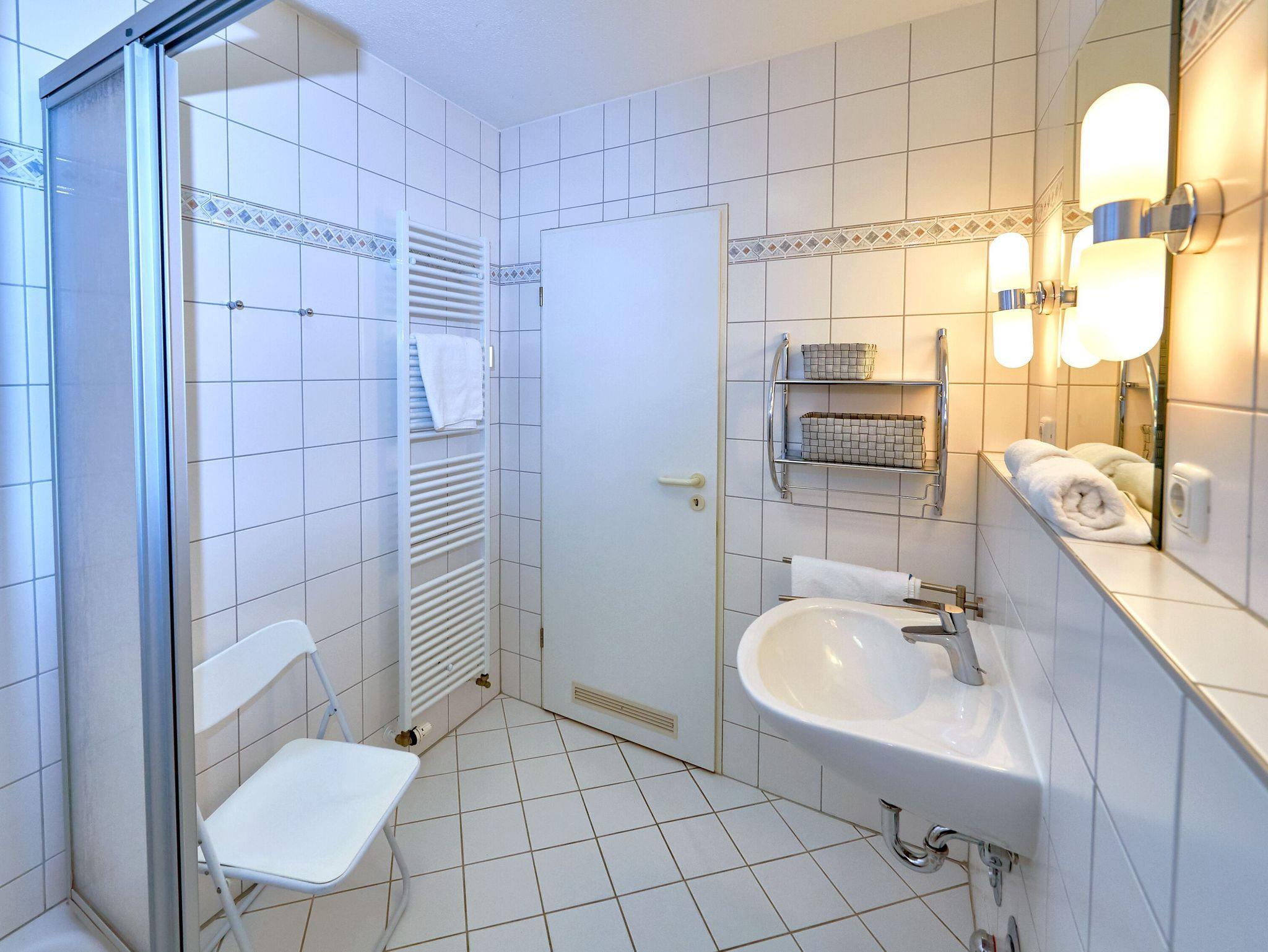 Das innenliegende, geflieste Bad verfügt über Dusche/WC, einen beleuchteten Waschtisch, einen Handtuchwärmer sowie einen Fön und einen Badezimmerstuhl zum bequemen An- und Auskleiden.