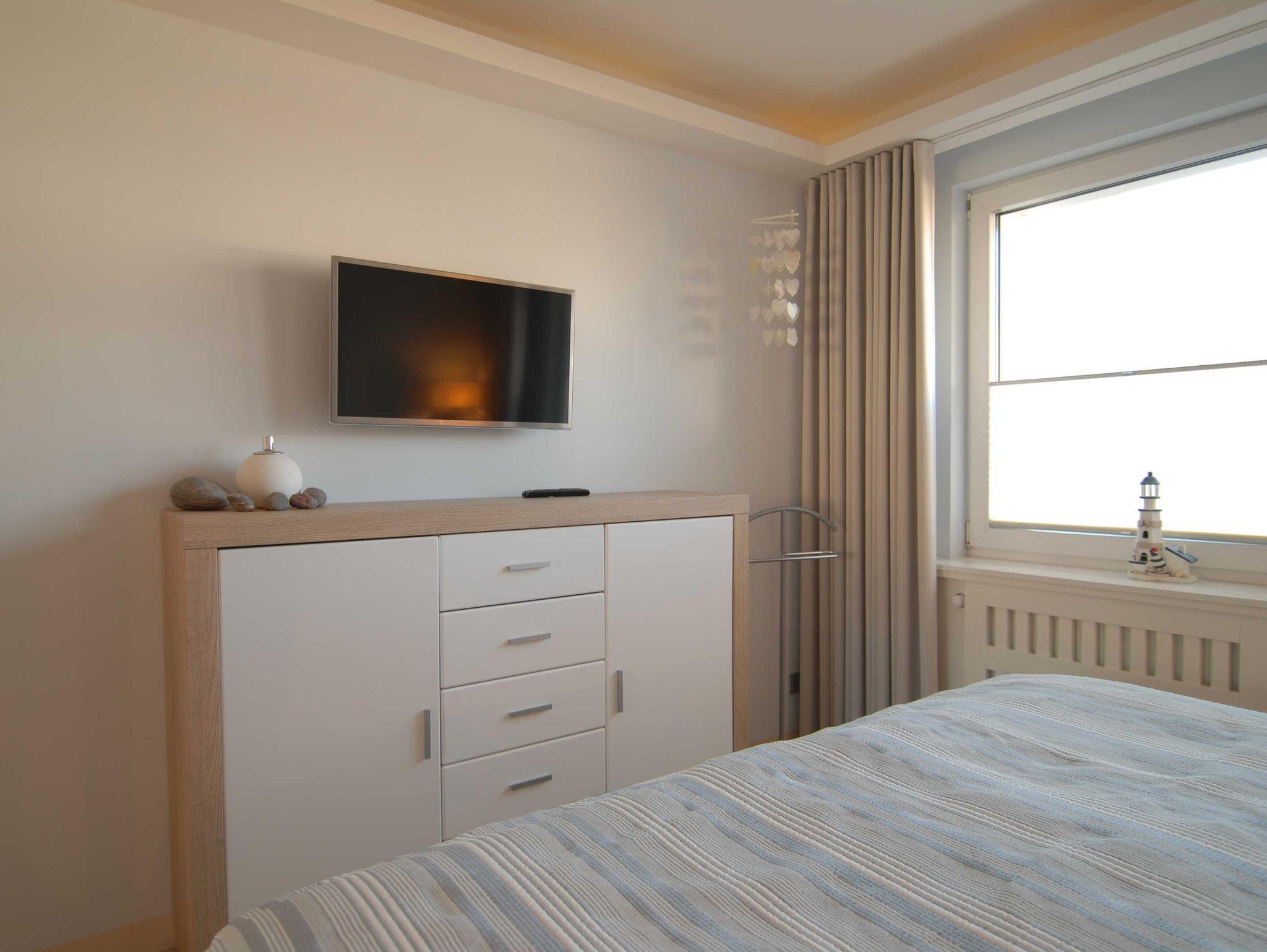 Beide Schlafzimmer verfügen über Boxspringbetten (1,80 x 2,00 m durchgängiger Topper), Schiebeschränke, Nachtkonsolen, Radiowecker und Verdunklungsvorhänge. Im größeren Schlafzimmer befinden sich außerdem noch ein SMART-TV-Gerät und ein Safe.