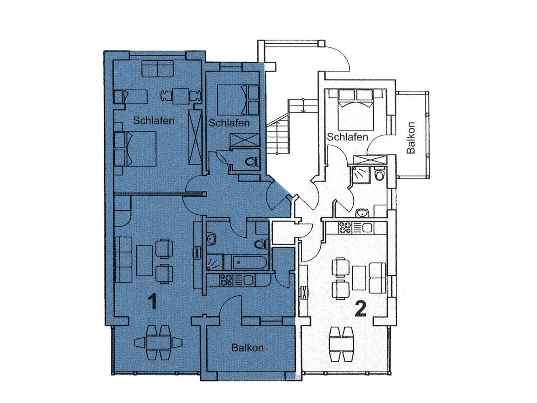 Das 92 qm große Apartment 1 ist für bis zu 6 Personen geeignet.