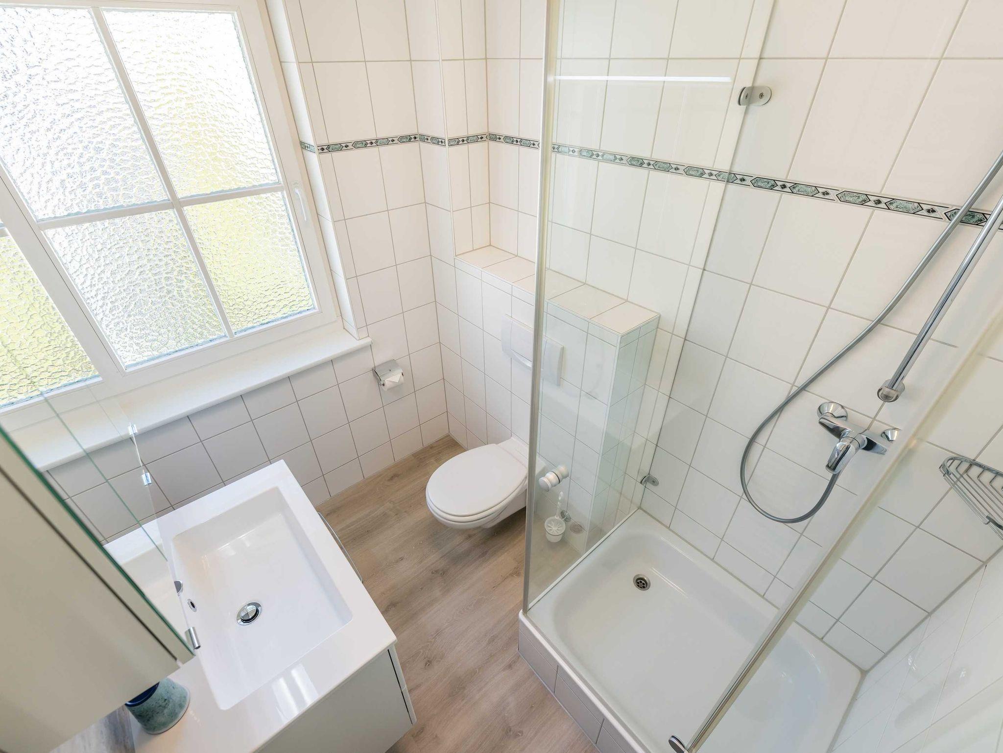 Im Tageslichtbad finden Sie eine Echtglasdusche, Spiegelschrank und WC.