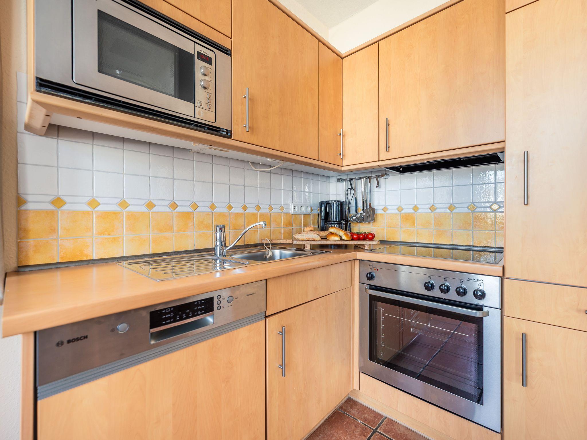 • Küche: Mikrowelle, Backofen, Geschirrspülmaschine, Kühlschrank mit Gefrierfach, Kaffeemaschine, Toaster und Wasserkocher