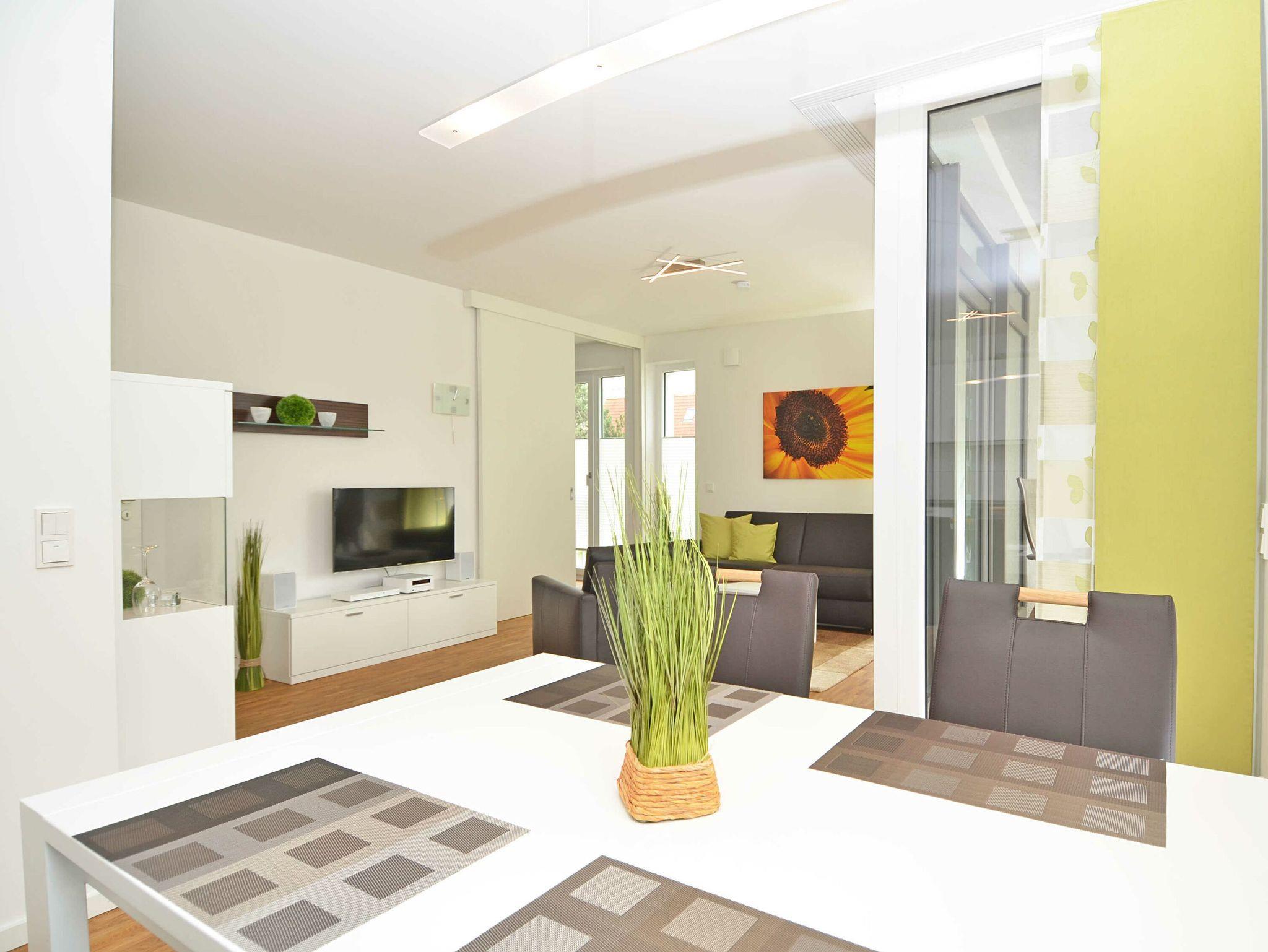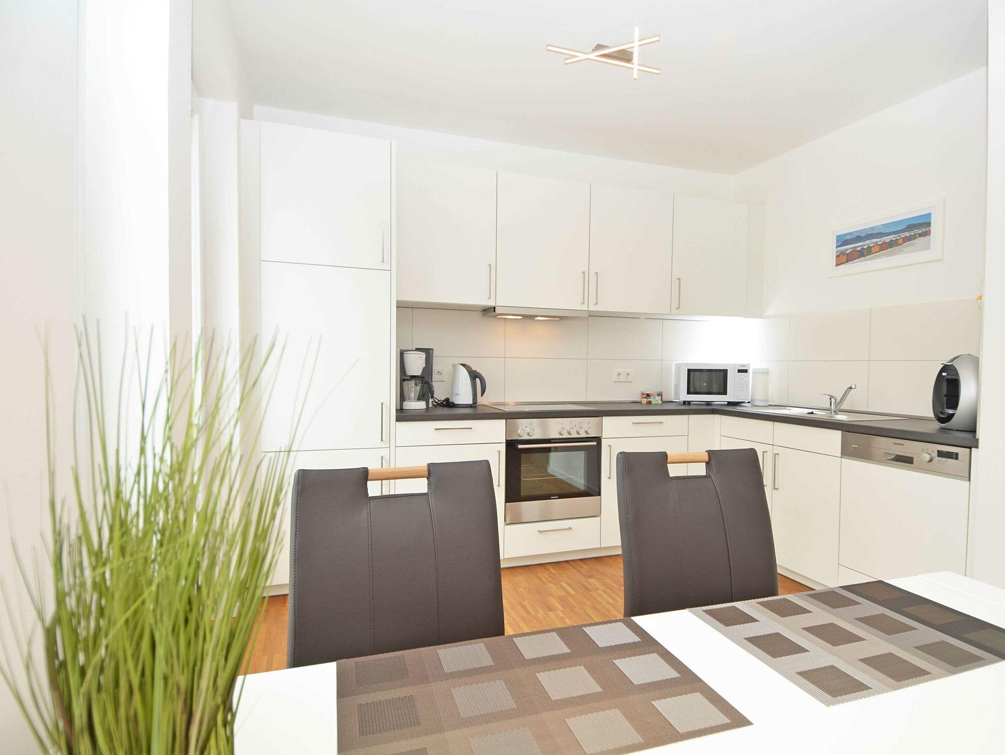 Das rund 68 m² große, hochwertig und geschmackvoll eingerichtete 2-Raum-Appartement erwartet Sie im 1. Obergeschoss und ist bequem mit dem Fahrstuhl zu erreichen. Die Nichtraucher-Wohnung ist ideal für 2 Personen, kann jedoch auch von 3 Personen genutzt werden und ist dafür großzügig eingerichtet und komplett ausgestattet. Echtholzparkett in den Wohnräumen und Fußbodenheizung im gesamten Appartement unterstreichen das moderne und angenehme Ambiente.