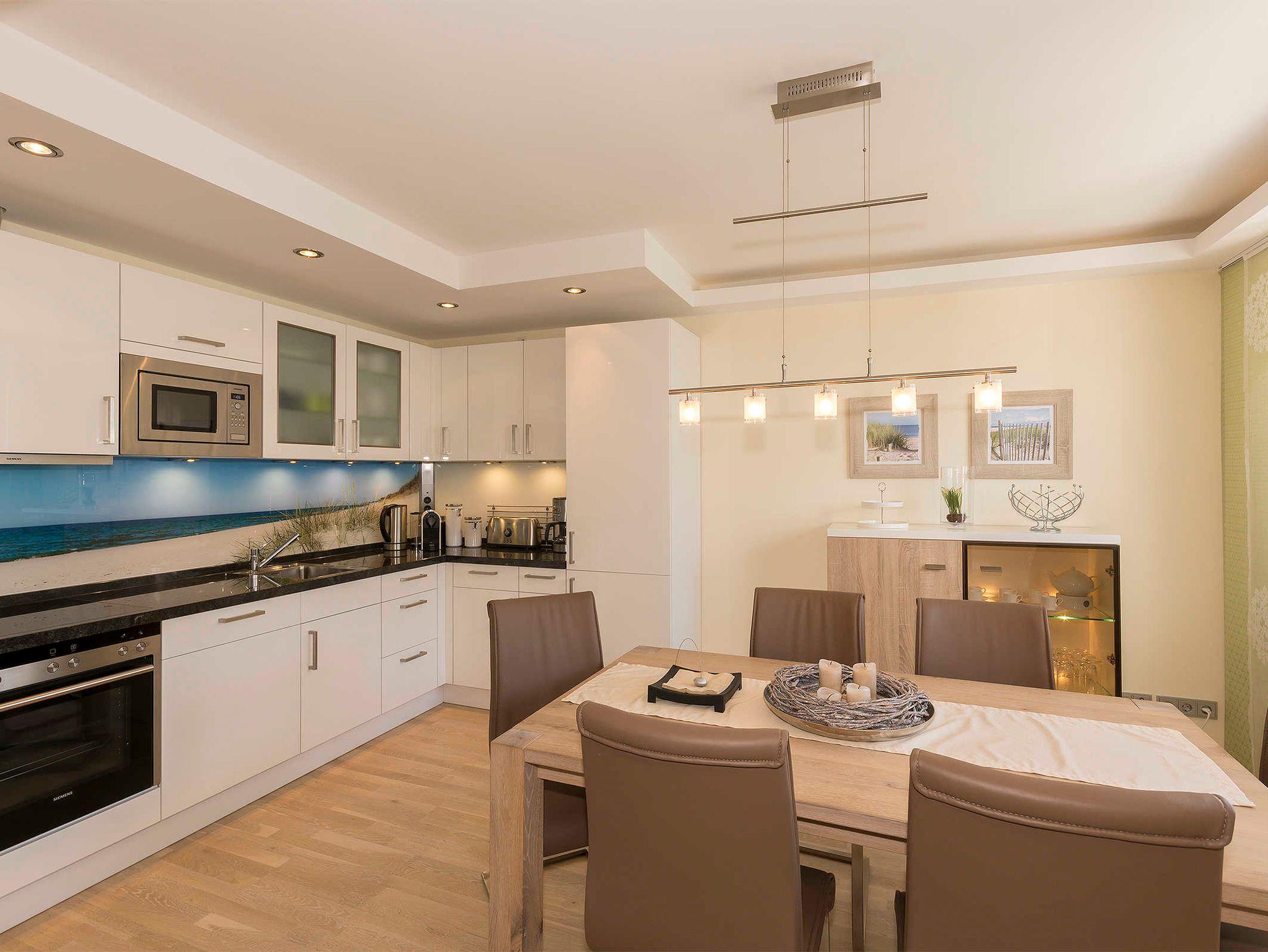 Die integrierte Küchenzeile ist mit Backofen,Cerankochfeld, Geschirrspüler, Kühlschrank und Gefrierschrank ausgestattet. Die komfortablen, modernen Sofa´s im Wohnraum können bequem als Schlafgelegenheit für eine 5.+6. Person genutzt werden.