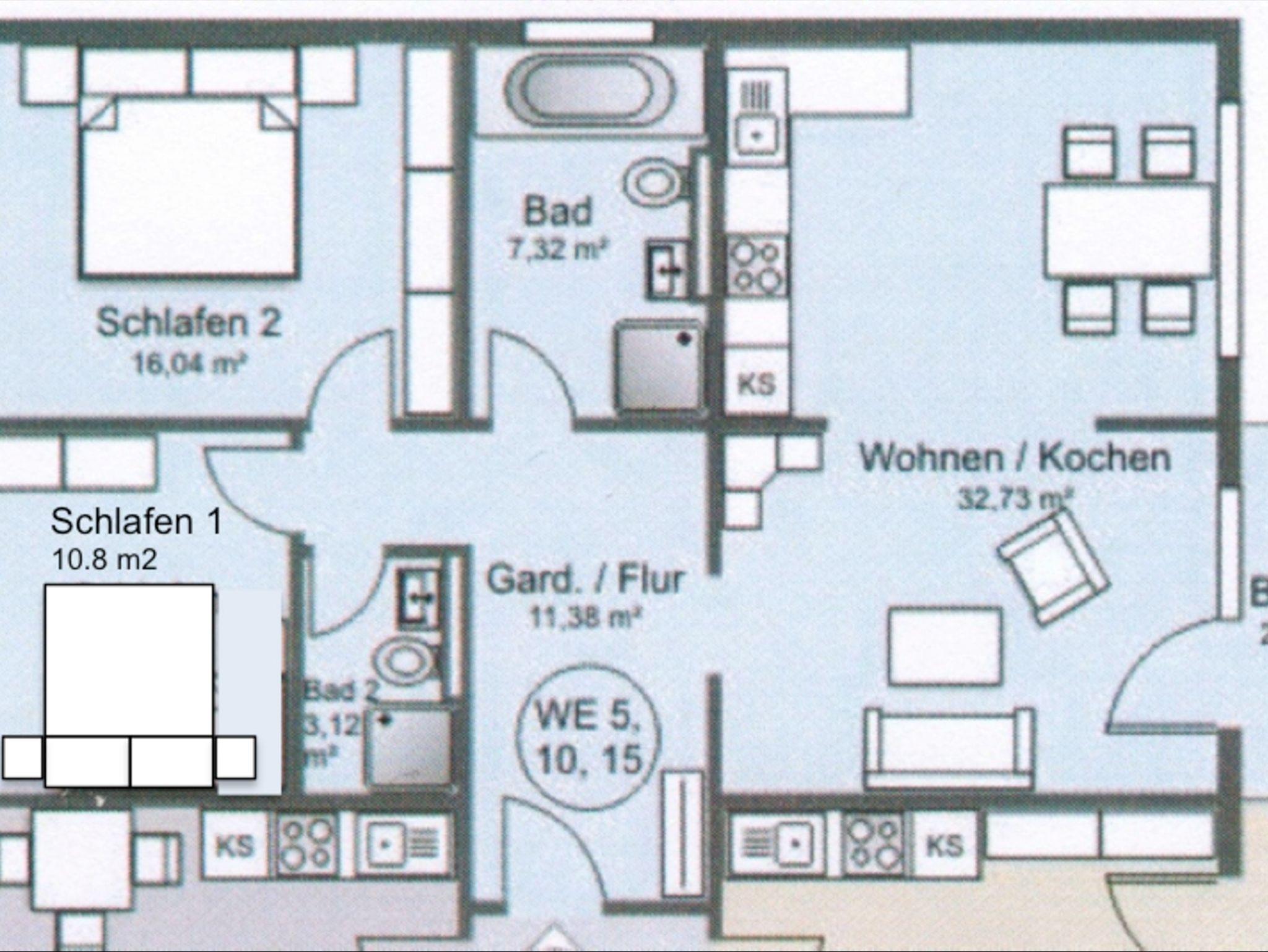 Ein großer Eingangsbereich, großzügiger, heller Wohnraum mit Sitzbereich, offener Küche und Essbereich. Es besteht ein Südbalkon vom 3m² mit Sitzgelegenheit und Strandkorb zum Sonnen.