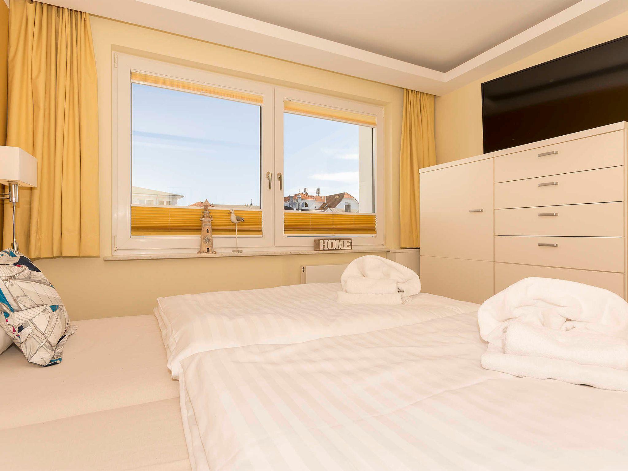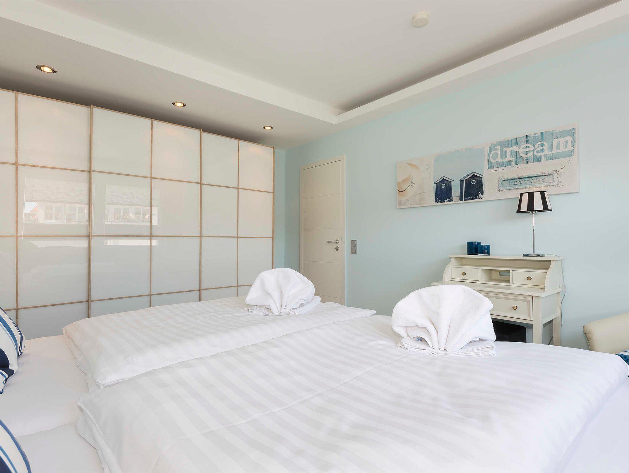 In den separaten, geschmackvoll gestalteten Schlafzimmern befinden sich je ein Boxspringbett ( 2x90 cm x 2,00 m und 2x 1,00 m x2,00m) mit Nachtkonsolen und ausreichend Stauschränken nach Maß.