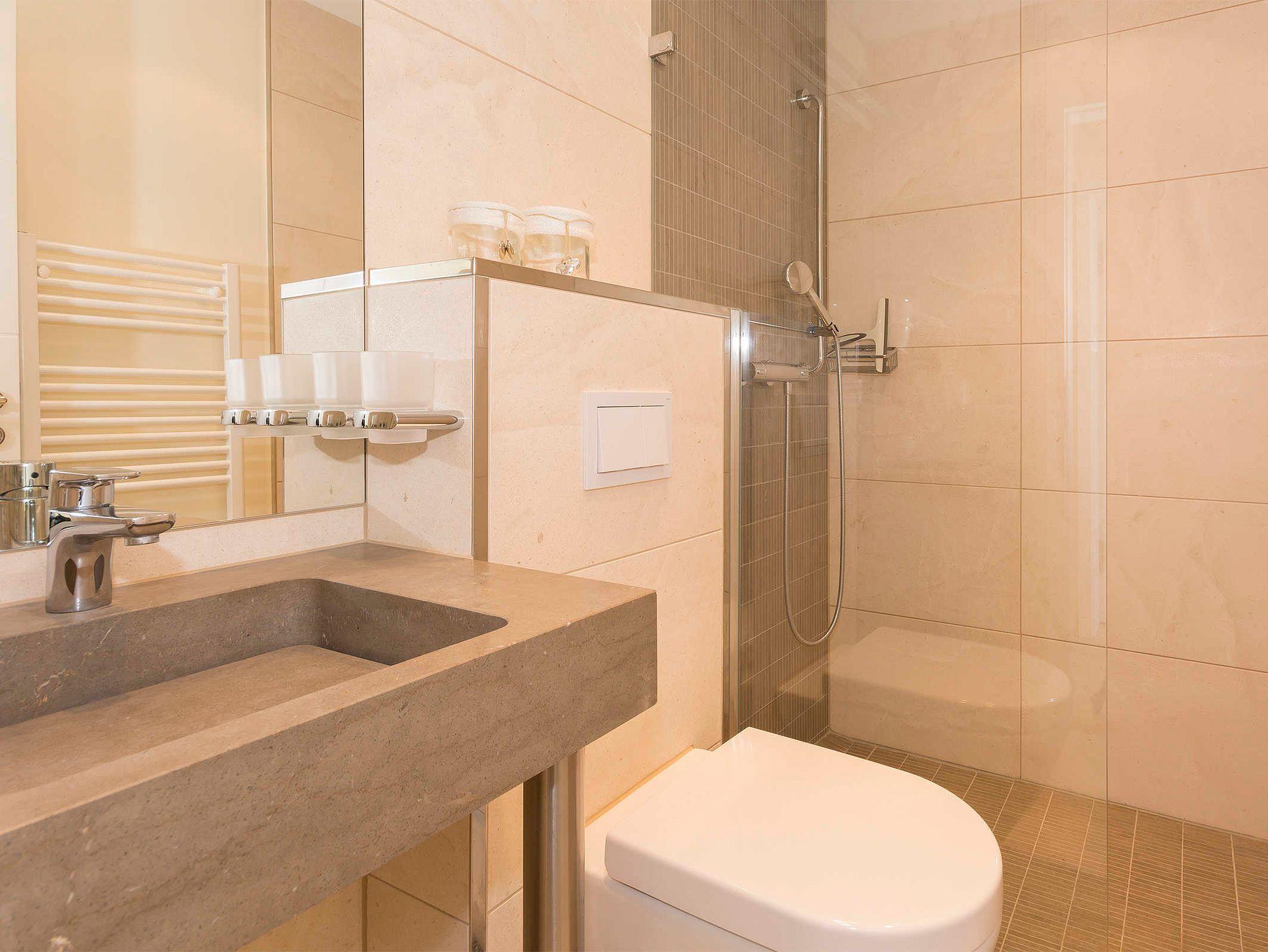 Die Bäder sind hochwertig mit Marmor und barrierefreien Design- Duschen modern und sehr elegant gestaltet. Das Masterbad verfügt zusätzlich über eine Badewanne.