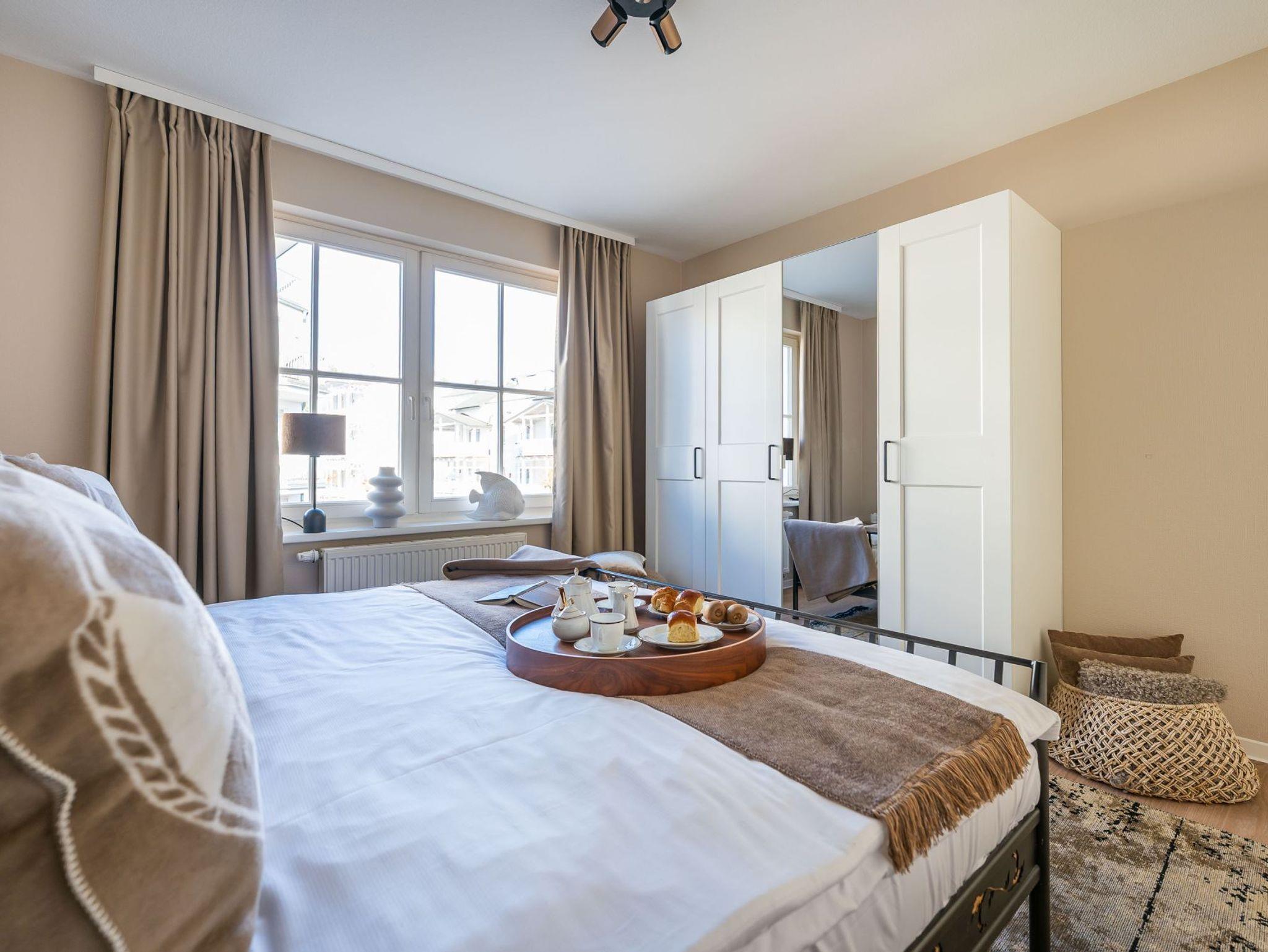 Ein komfortabeles Doppelbett mit verstellbaren Lattenroste und Kleiderschrank finden Sie im Schlafzimmer.