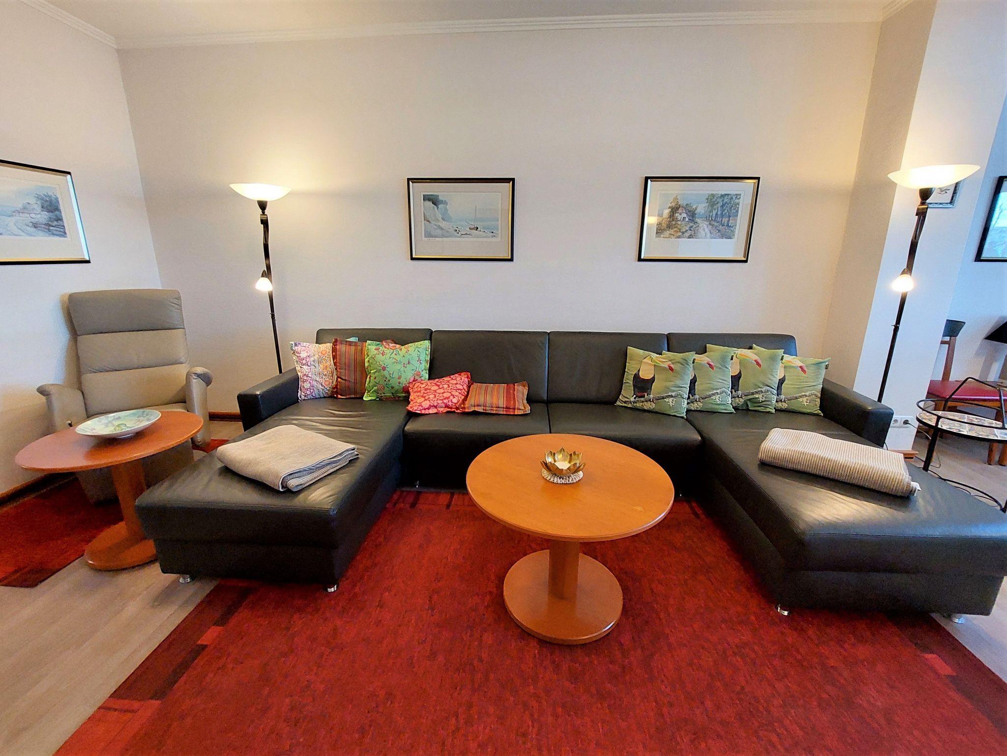 Das komfortable und stilvolle App. 553, im Hochparterre gelegen, verfügt über ein großes Wohn-/Esszimmer mit einer Ledercouchgarnitur. Sie kann zu einem bequemen Bett umfunktioniert werden für eine 5./6. P. (Liegefläche 1,40 m x 2,00 m), gegen Gebühr. Es gibt einen 55 Zoll Smart TV, Radio mit CD, USB u. Bluetooth und einen DVD-Blu-ray-Player. WLAN ist inklusive.