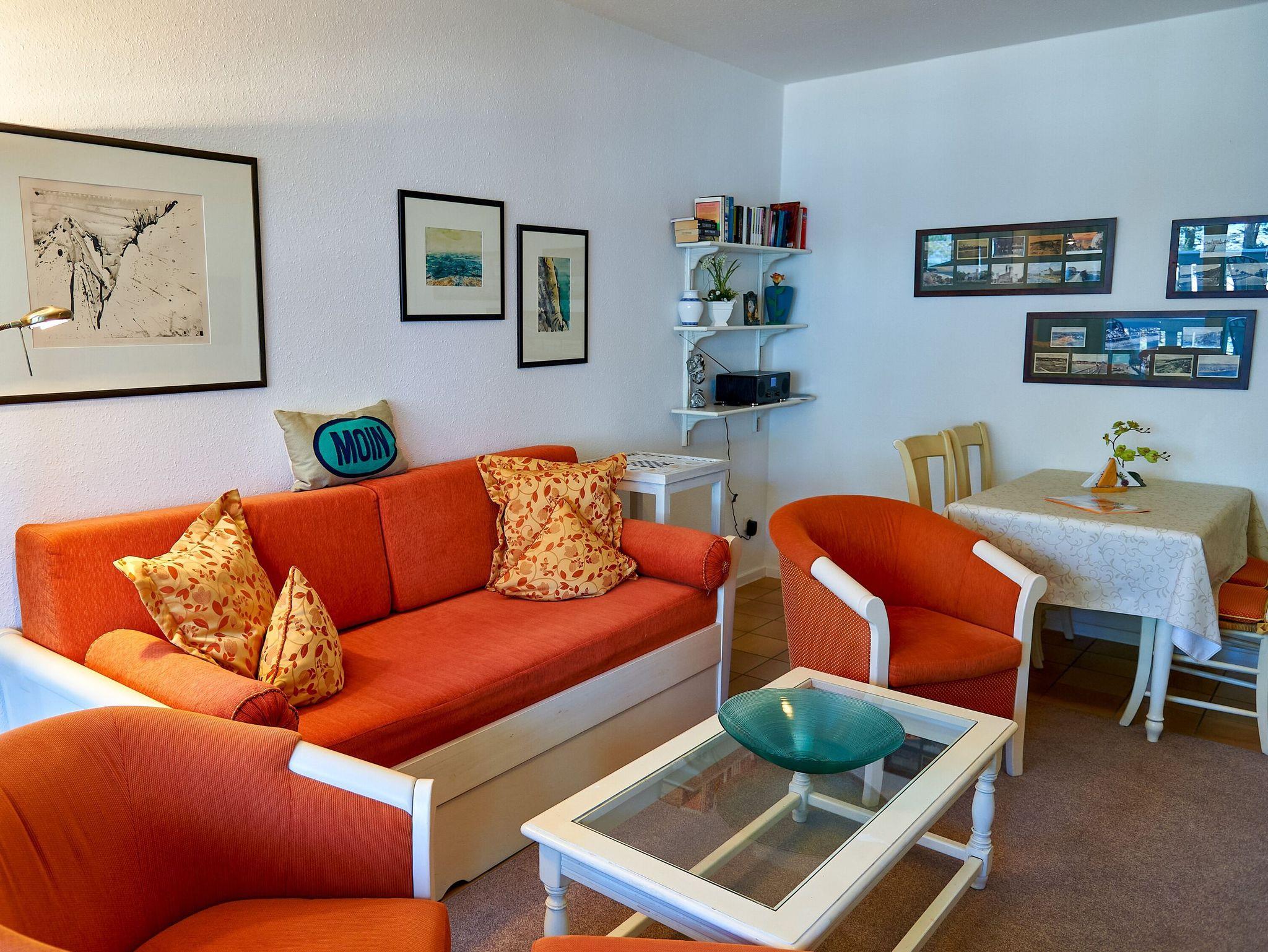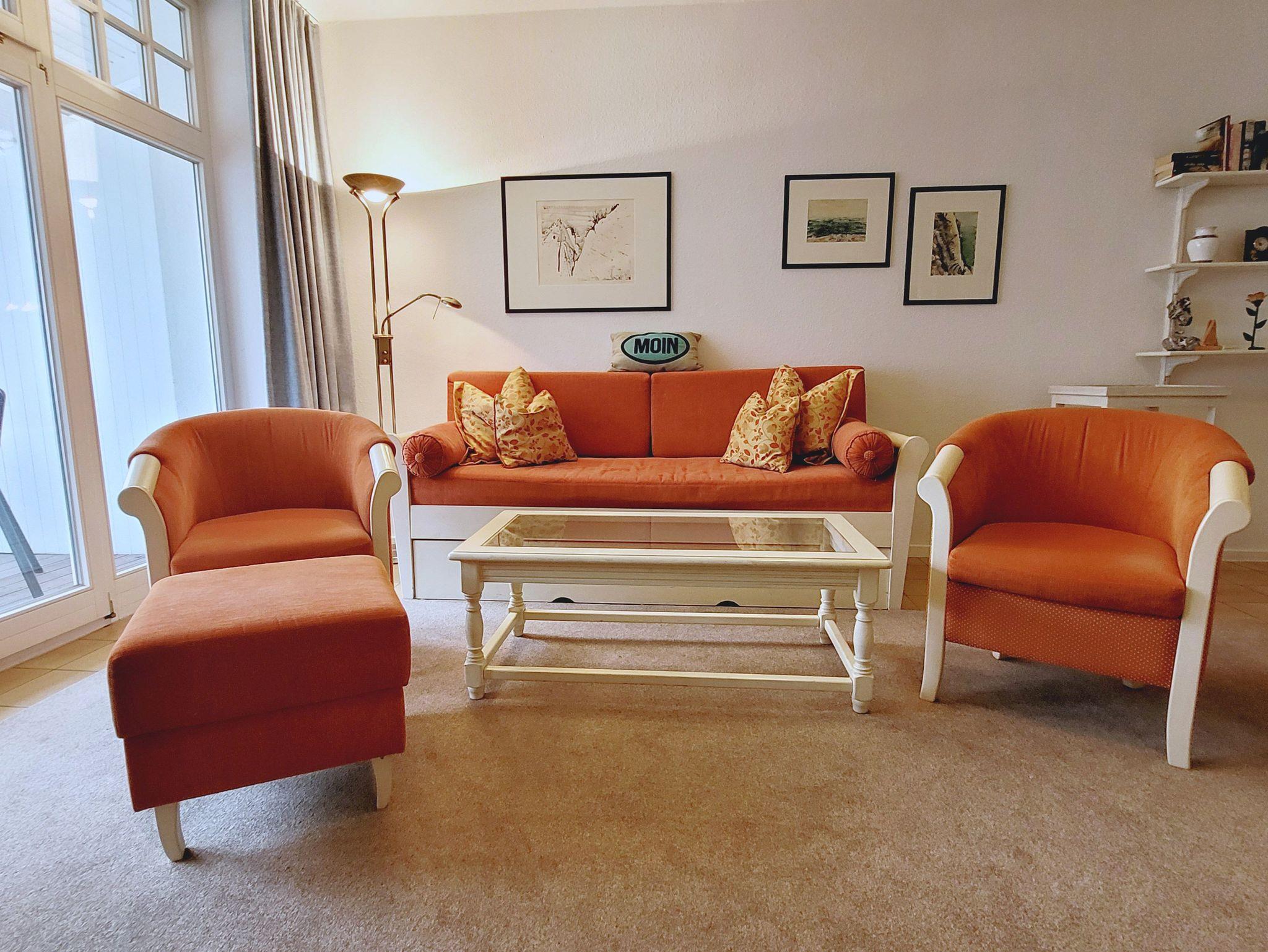 Der hell und freundlich eingerichtete Wohnraum verfügt über einen großen Esstisch für 4 Personen, eine bequeme Schlafcouch sowie einen hochwertigen LOEWE-Flachbild-TV. Vom Wohnraum aus gelangen Sie auf die große möblierte Loggia und können dort mit Blick auf das Meer und das Treiben auf der autofreien Strandpromenade speisen und die Zeit genießen. Die gesamte Wohnung ist mit Bodenfliesen in warmen Naturtönen ausgestattet. Die Wandfliesen in Küche und Bad wurden von der bekannten Keramikerin Kathrin Grünke original für diese Wohnung angefertigt. An den Wänden laden Aquarelle der Rüganer Maler H. Petrick, W. Goes, Ch. Rosenow zum Entdecken, Staunen und sich Freuen ein.