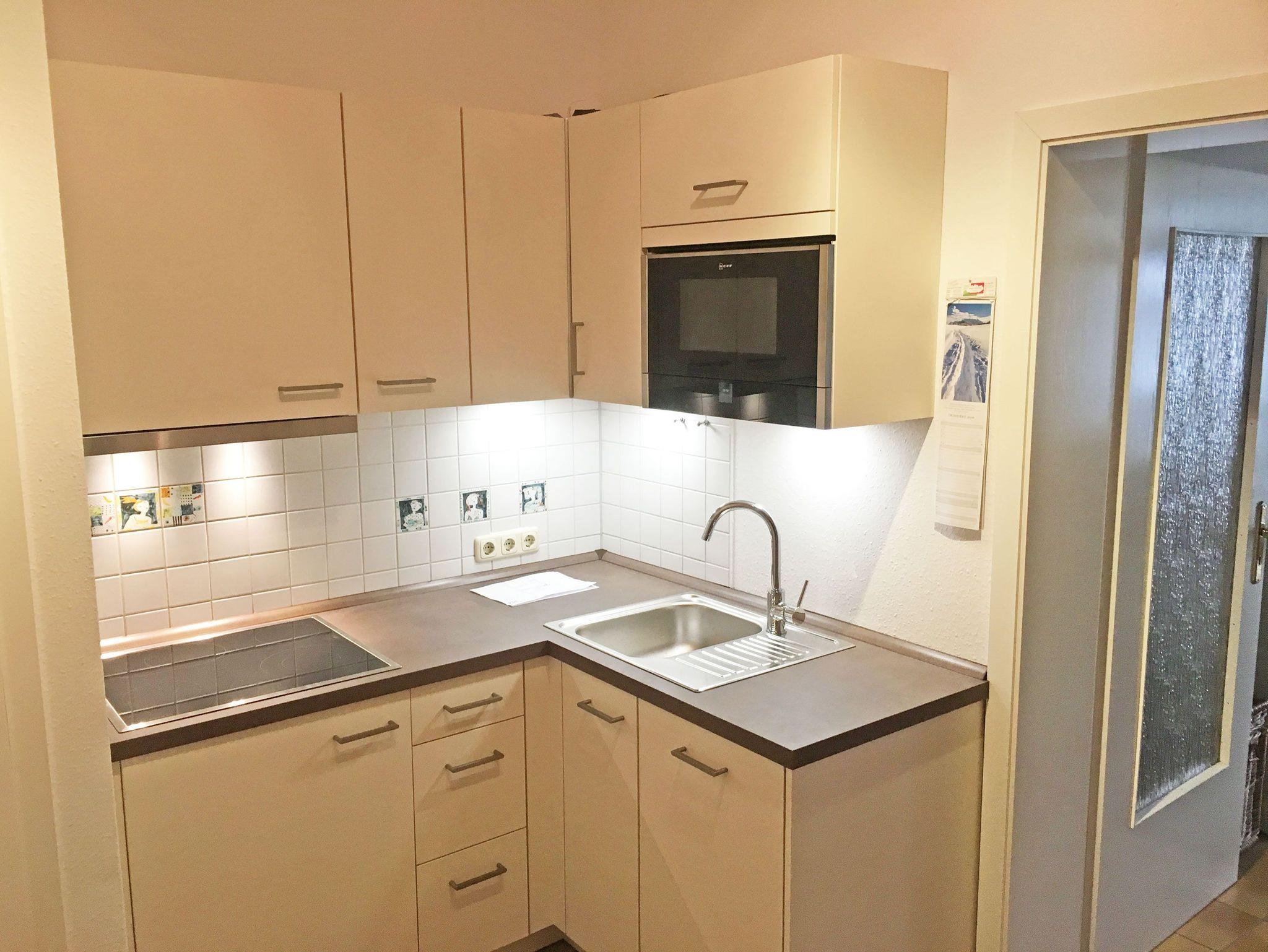 Die in den Eingangsbereich harmonisch integrierte, hochwertige Einbauküche ist mit einem Cerankochfeld, einer Dunstabzugshaube, Kaffeemaschine, Teekocher, Mikrowelle, Kühlschrank mit Tiefkühlfach, Toaster, Wasserkocher, Geschirrspüler und diversem Kleininventar ausgestattet. Im modern gefliesten Badezimmer finden Sie neben einer großzügigen Dusche mit Glastür auch einen Handtuchwärmer und einen Haartrockner.