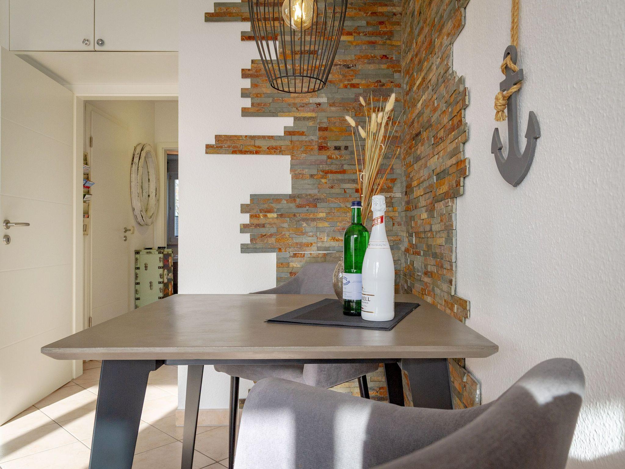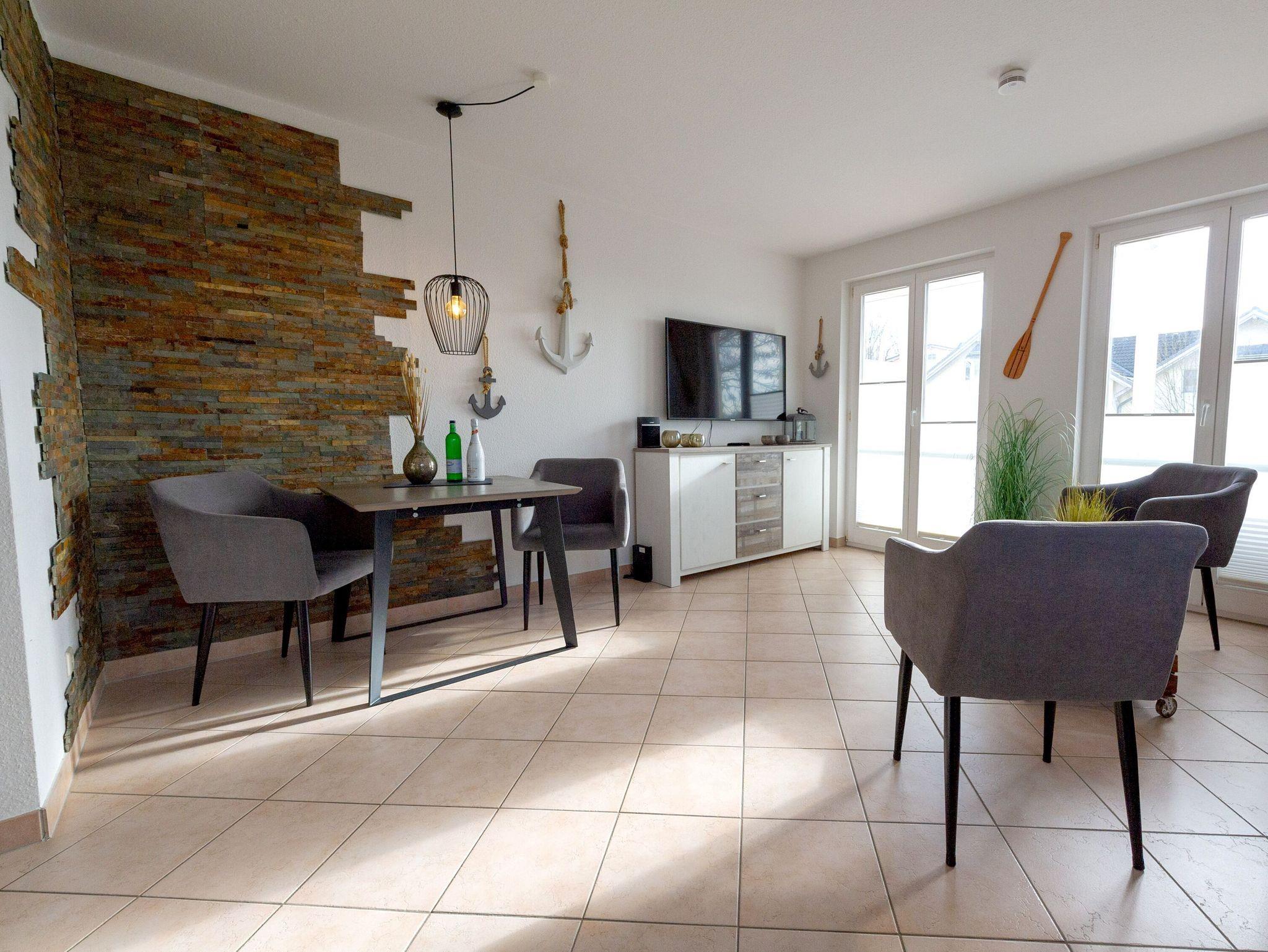Über den Flur mit Garderobe und Einbauschrank gelangen Sie ins kombinierte Wohn- und Esszimmer. Hier befinden sich u.a. ein Esstisch für 4 Personen, ein LCD-Fernseher, ein Blu-Ray-Player, eine Bose Sound Touch Mini Music Systemanlage sowie eine gemütliche Sitzgarnitur mit Sofa. Dieses kann mit wenigen Handgriffen in eine komfortable Schlafgelegenheit für zwei Personen (1,60 m breit) verwandelt werden.