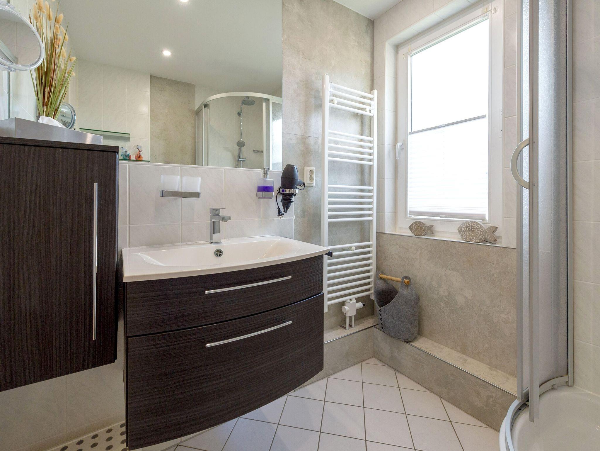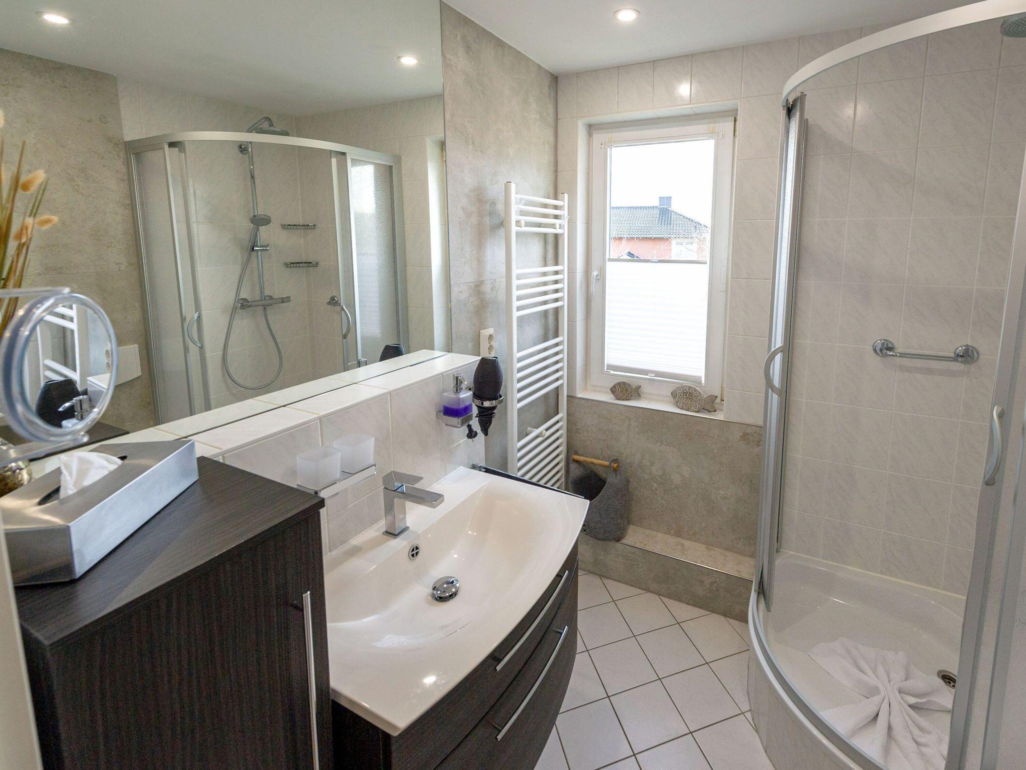 Darüber hinaus steht Ihnen ein modernes Tageslichtbad mit Dusche/WC, Waschtisch, großem Wandspiegel, Fön, Kosmetikspiegel und Handtuchheizung zur Verfügung.