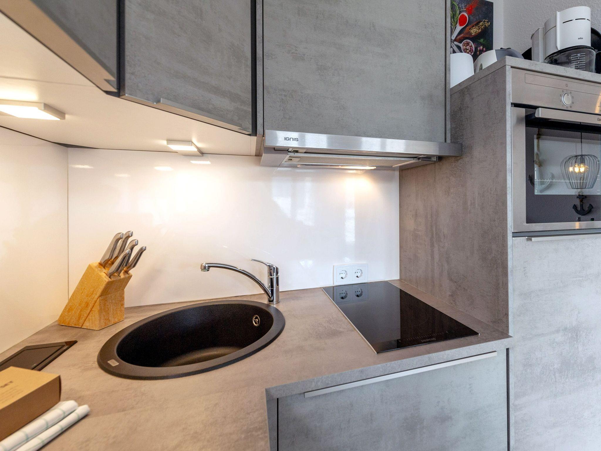 Die in den Wohnbereich integrierte Küchenzeile überzeugt mit ihrer umfangreichen Ausstattung, u.a. einem Kühlschrank mit Gefrierfach, einem Backofen, einem 2-Zonen-Induktionskochfeld, einer Spülmaschine sowie einer DeLonghi-Kaffeemaschine. Selbstverständlich fehlen auch ein Wasserkocher, ein Toaster sowie das nötige Koch- und Essgeschirr nicht.