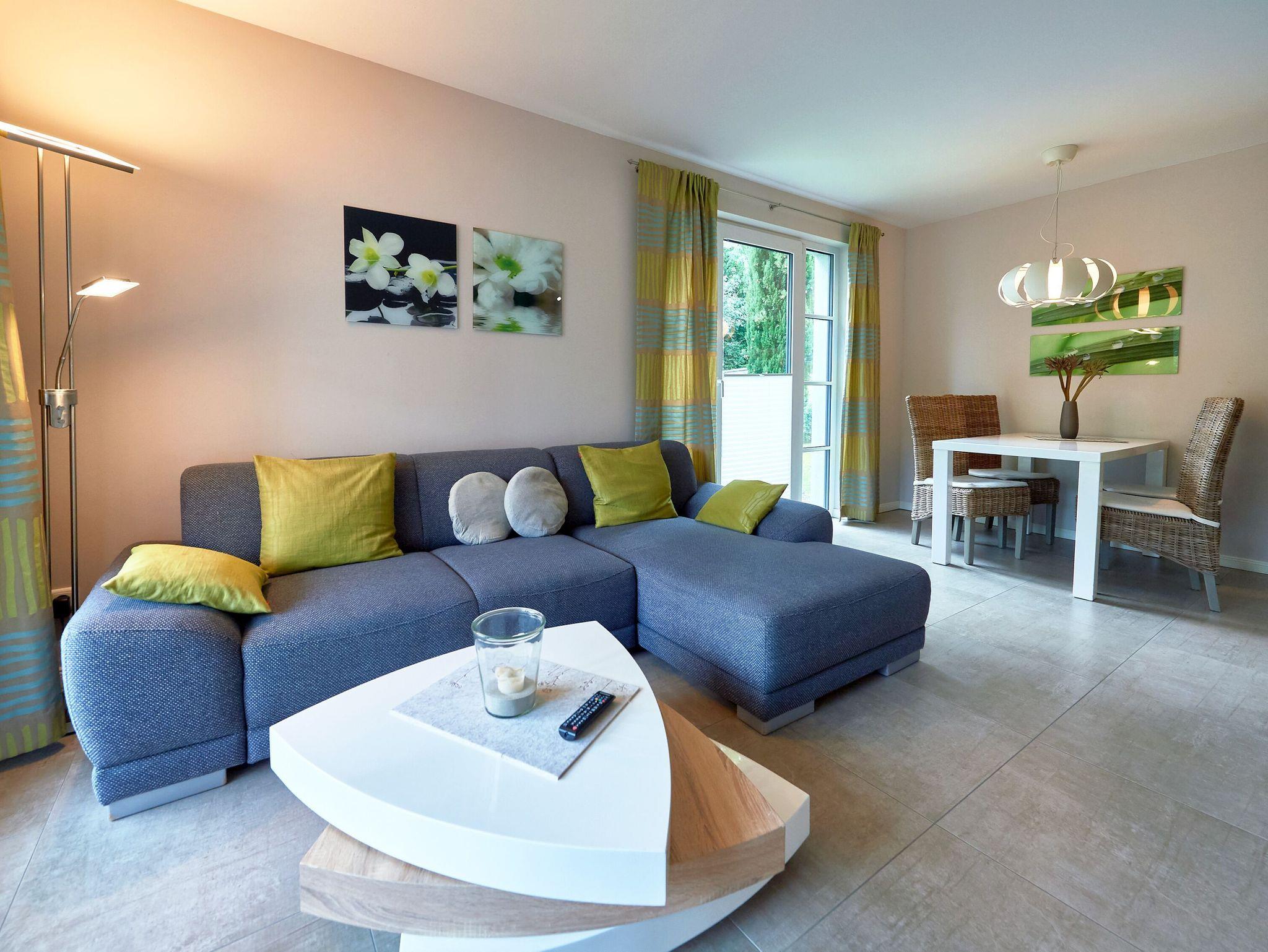 Das großzügige Wohn- und Esszimmer mit integrierter Küche ist geschickt in die verschiedenen Funktionsbereiche aufgeteilt. Bodentiefe Fenster, angenehme Farben, chice Dekorationen und die moderne Polstereckgruppe (mit Schlaffunktion 1,30 x 2,00m) vermitteln sofort ein Wohlgefühl. Für die mediale Unterhaltung stehen ein 55 Zoll Smart-TV, ein Tischradio und natürlich auch kostenfreies W-LAN zur Verfügung.